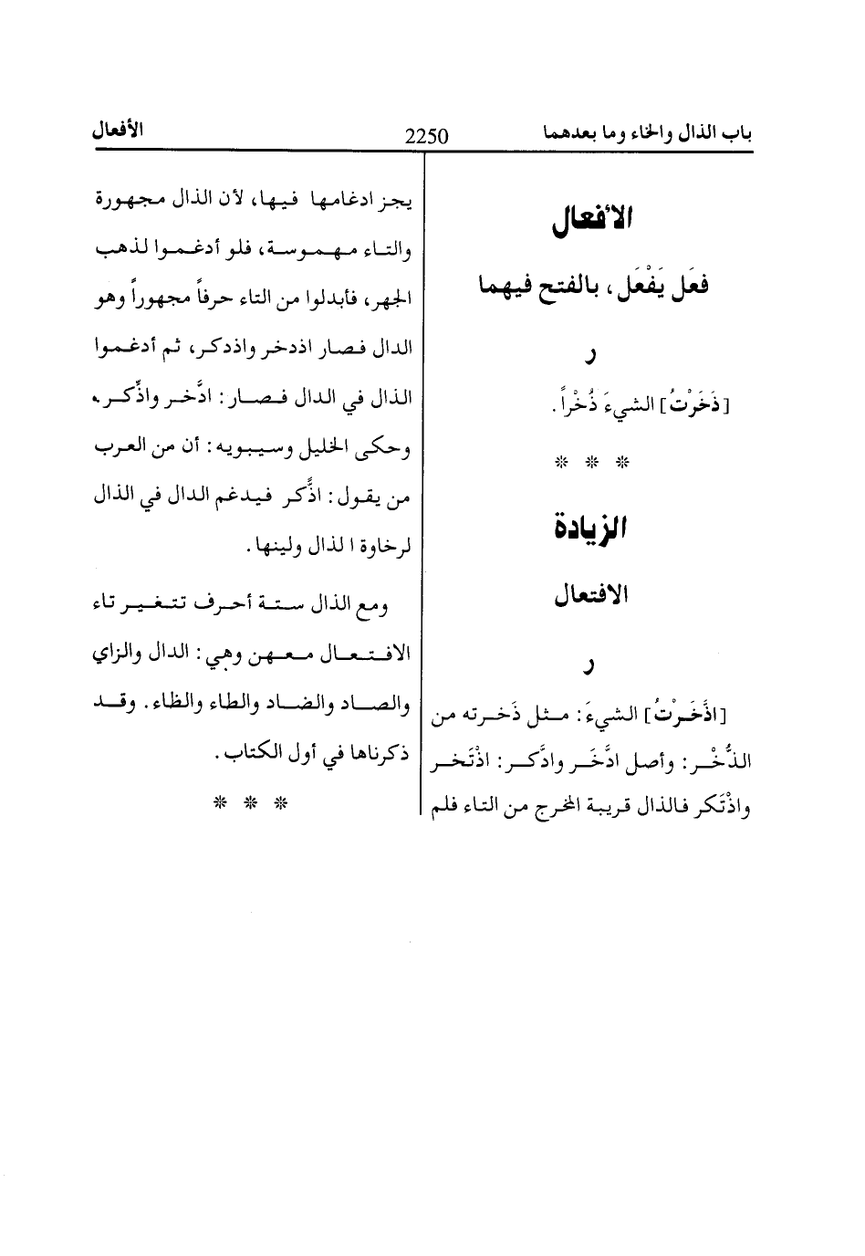 [اذَّخَرْتُ] الشيءَ: مثل ذَخرته من الذُّخْر: وأصل ادَّخَر وادَّكر: اذْتَخر واذْتَكر فالذال قريبة المخرج من التاء فلم يجز ادغامها فيها، لأن الذال مجهورة والتاء مهموسة، فلو أدغموا لذهب الجهر، فأبدلوا من التاء حرفاً مجهوراً وهو الدال فصار اذدخر واذدكر، ثم أدغموا الذال في الدال فصار: ادَّخر واذِّكر.