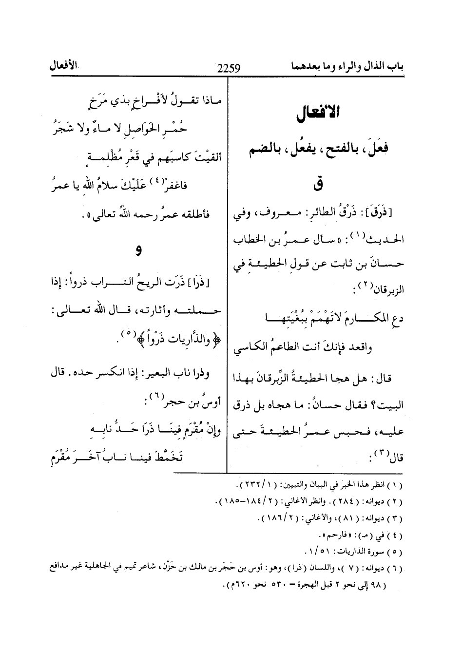 وفي الحديث «1»: «سأل عمرُ بن الخطاب حسانَ بن ثابت عن قولِ الحطيئةِ في الزبرقان «2»: