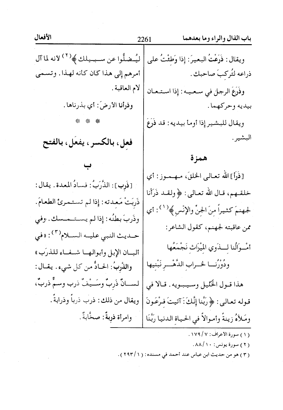 [ذَرَأ] الله تعالى الخلقَ، مهموز: أي خلقهم، قال الله تعالى: وَلَقَدْ ذَرَأْناا لِجَهَنَّمَ كَثِيراً مِنَ الْجِنِّ وَالْإِنْسِ «1»: أي ممن عاقبته لجهنم، كقول الشاعر:
