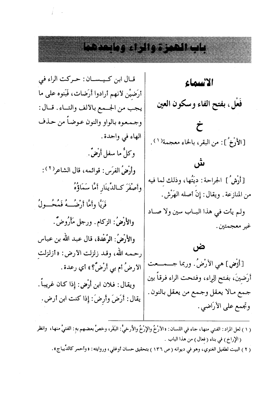 [أَرْض] هي الأَرْضُ. وربما جمعت أَرَضِينَ، بفتح الرِاء، وفتحت الراء فرقاً بين جمع ما لا يعقل وجمع من يعقل بالنون.