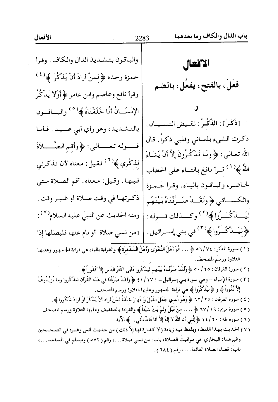 ذكرت الشيء بلساني وقلبي ذكراً. قال الله تعالى: وما تذكرون إلا أن يشاء الله «1» قرأ نافع بالتاء على الخطاب لحاضر، والباقون بالياء. وقرأ حمزة والكسائي وَلَقَدْ صَرَّفْنااهُ بَيْنَهُمْ لِيَذْكُرُوا «2» وكذلك قوله: