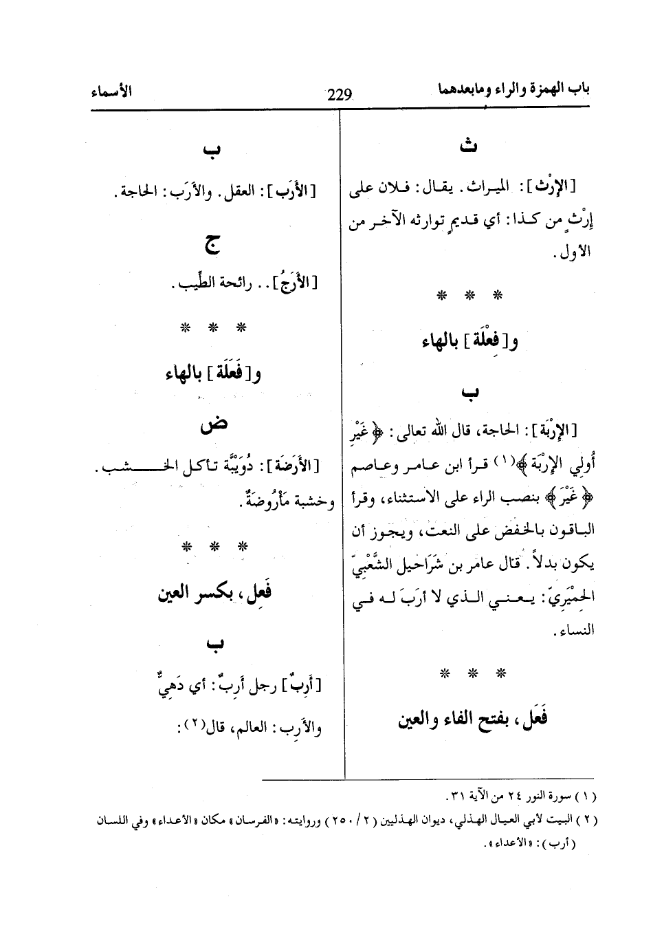 (2) البيت لأبي العيال الهذلي، ديوان الهذليين (2/ 250) وروايته: «الفرسان» مكان «الأعداء» وفي اللسان (أرب): «الأعداء».