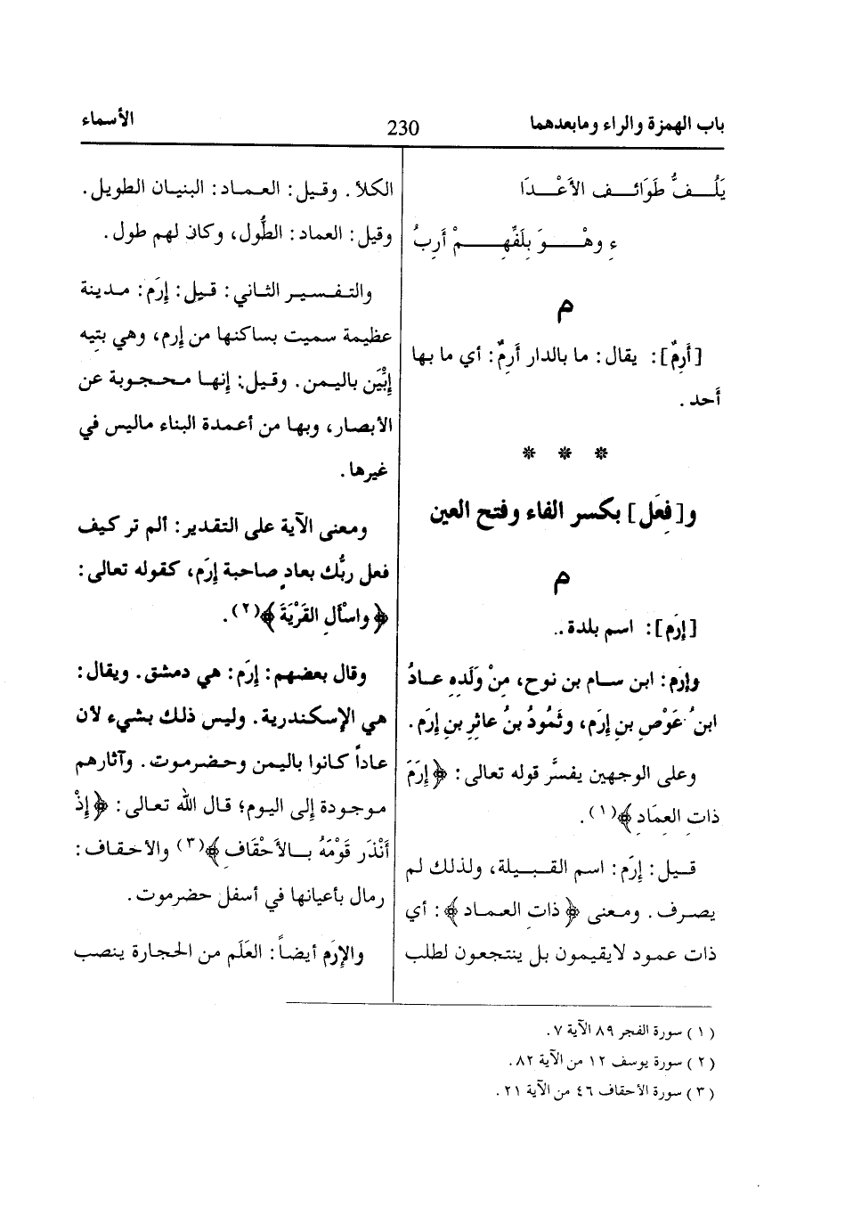 قيل: إِرَم: اسم القبيلة، ولذلك لم يصرف. ومعنى ذااتِ الْعِماادِ: أي ذات عمود لا يقيمون بل ينتجعون لطلب الكلأ. وقيل: العماد: البنيان الطويل.
