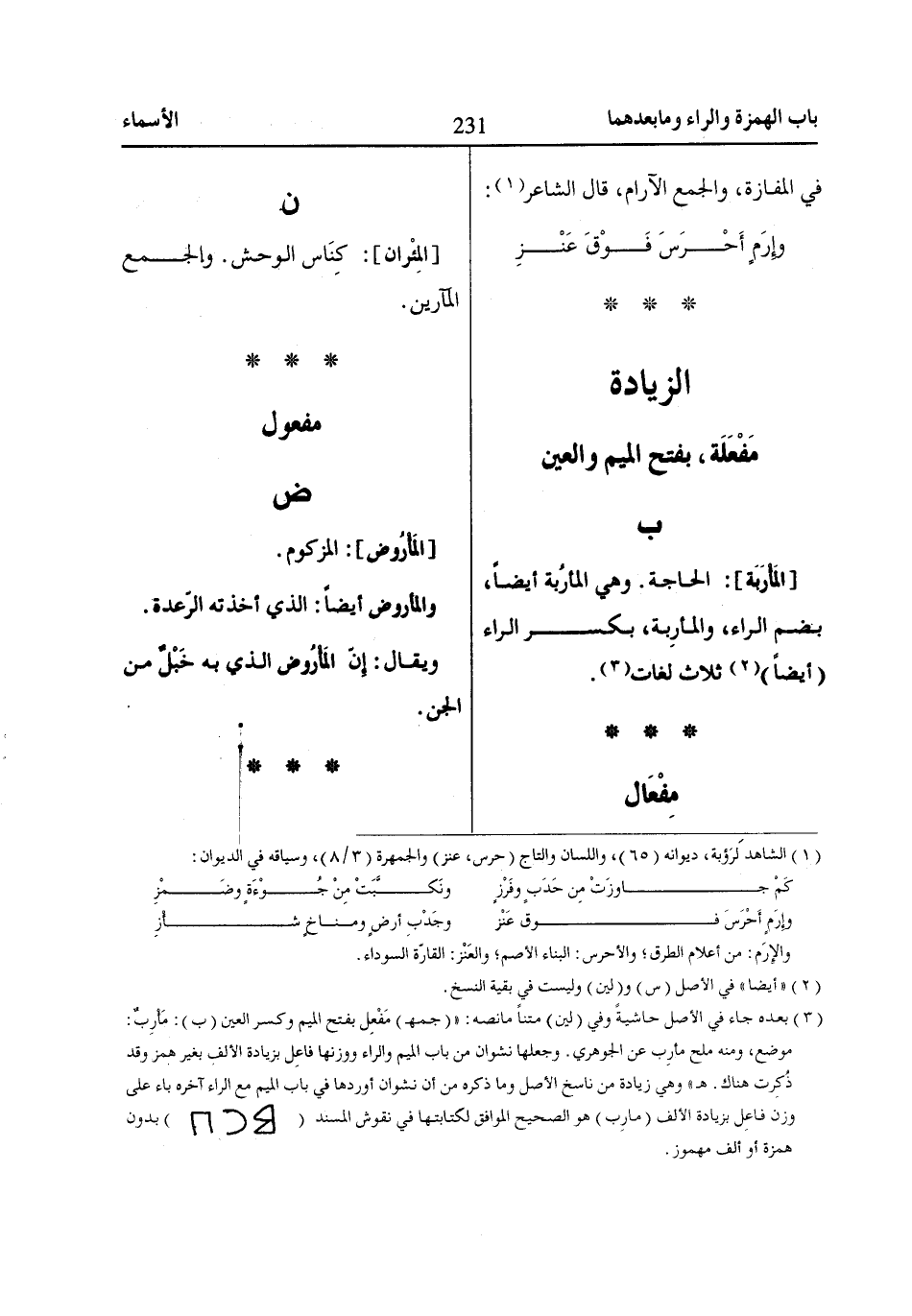 (3) بعده جاء في الأصل حاشيةً وفي (لين) متناً ما نصه: «(جمه) مَفْعِل بفتح الميم وكسر العين (ب): مَأْرِبٌ: