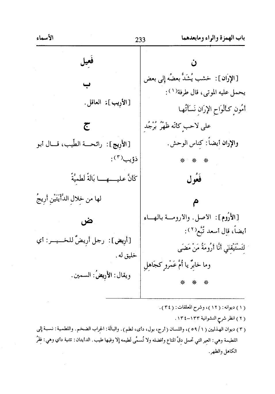 (3) ديوان الهذليين (1/ 59)، واللسان (أرج، بول، دأى، لطم). والبالَة: الجِراب الضخم. واللطمية: نسبة إِلى اللطيمة وهي: العِير التي تحمل دِقَّ المتاع وأفضله ولا تُسمَّى لَطيمة إِلا وفيها طيب. والدأيتان: تثنية دأي وهي: فِقَرُ الكاهل والظهر.