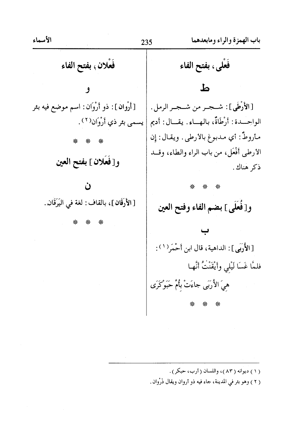 الواحدة: أَرْطَاةٌ، بالهاء. يقال: أَديم مأروطٌ: أي مدبوغ بالأرطى. ويقال: إِن الأرطى أَفْعَل، من باب الراء والطاء، وقد ذكر هناك.