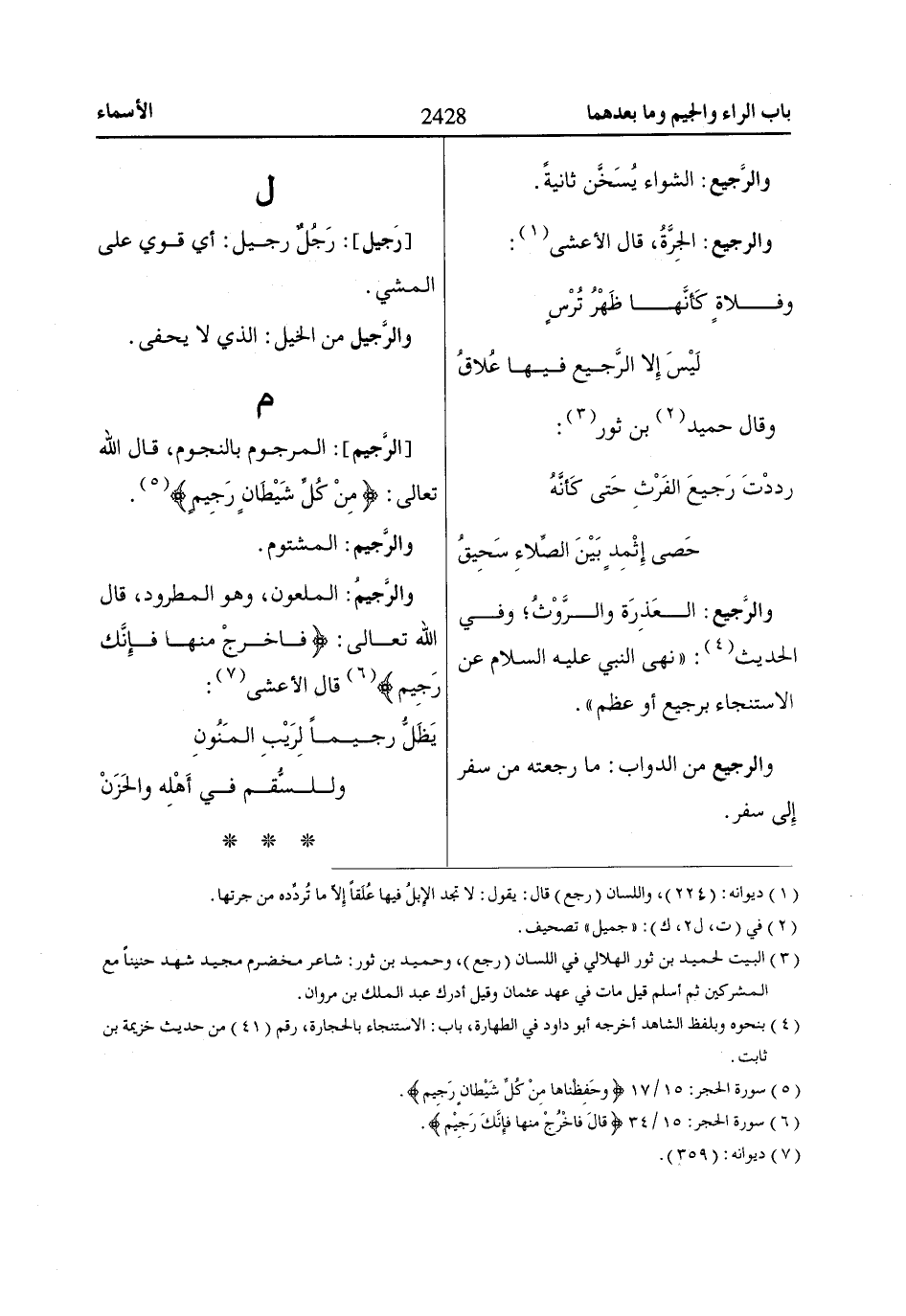 (3) البيت لحميد بن ثور الهلالي في اللسان (رجع)، وحميد بن ثور: شاعر مخضرم مجيد شهد حنيناً مع المشركين ثم أسلم قيل مات في عهد عثمان وقيل أدرك عبد الملك بن مروان.