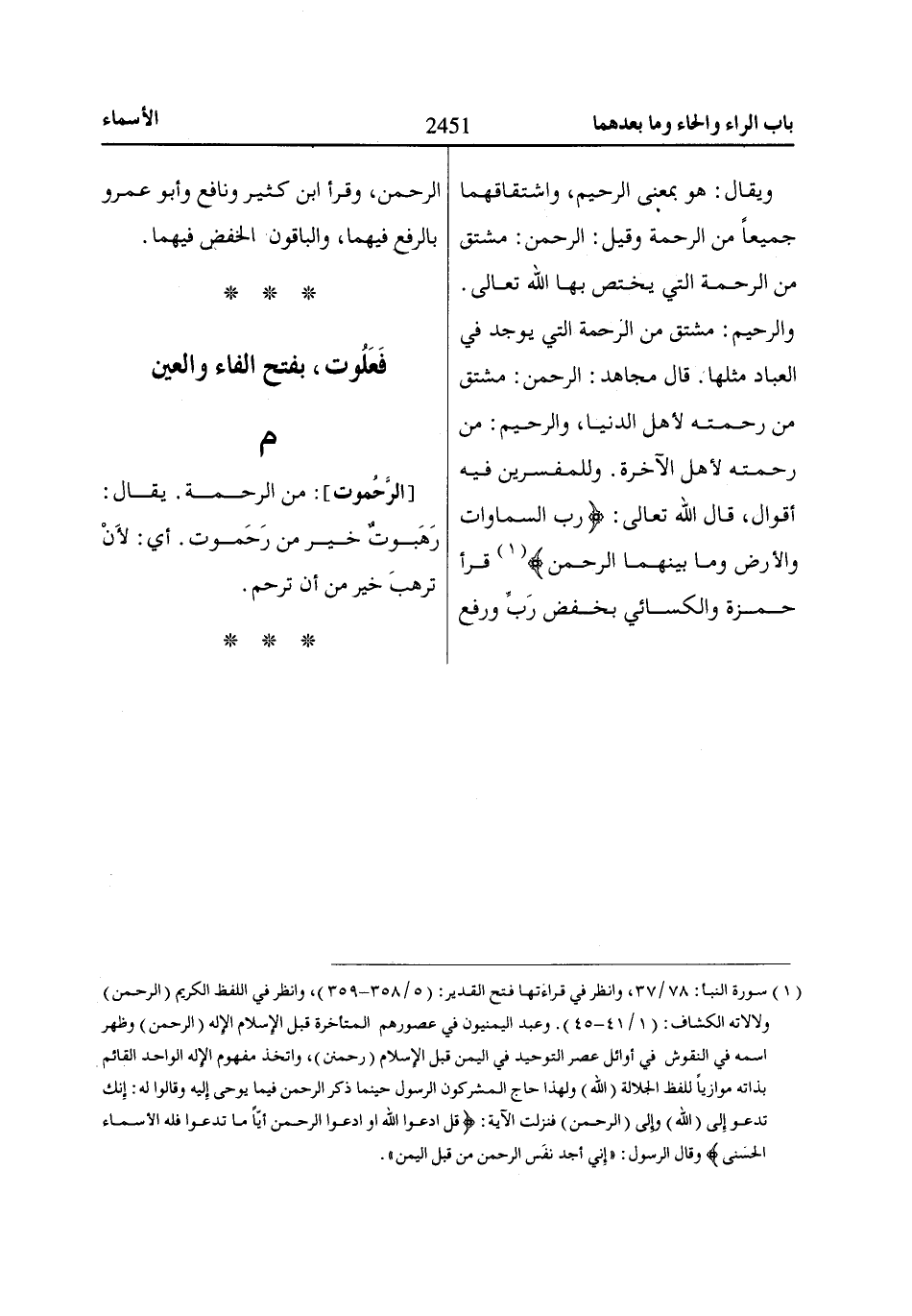 (1) سورة النبأ: 78/ 37، وانظر في قراءتها فتح القدير: (5/ 358 - 359)، وانظر في اللفظ الكريم (الرحمن) ولالاته الكشاف: (1/ 41 - 45). وعبد اليمنيون في عصورهم المتأخرة قبل الإسلام الإله (الرحمن) وظهر اسمه في النقوش في أوائل عصر التوحيد في اليمن قبل الإسلام (رحمنن)، واتخذ مفهوم الإله الواحد القائم بذاته موازياً للفظ الجلالة (الله) ولهذا حاج المشركون الرسول حينما ذكر الرحمن فيما يوحى إليه وقالوا له: إنك تدعو إلى (الله) وإلى (الرحمن) فنزلت الآية: قُلِ ادْعُوا اللّاهَ أَوِ ادْعُوا الرَّحْمانَ أَيًّا ماا تَدْعُوا فَلَهُ الْأَسْمااءُ الْحُسْنى وقال الرسول: «إني أجد نفَس الرحمن من قبل اليمن».