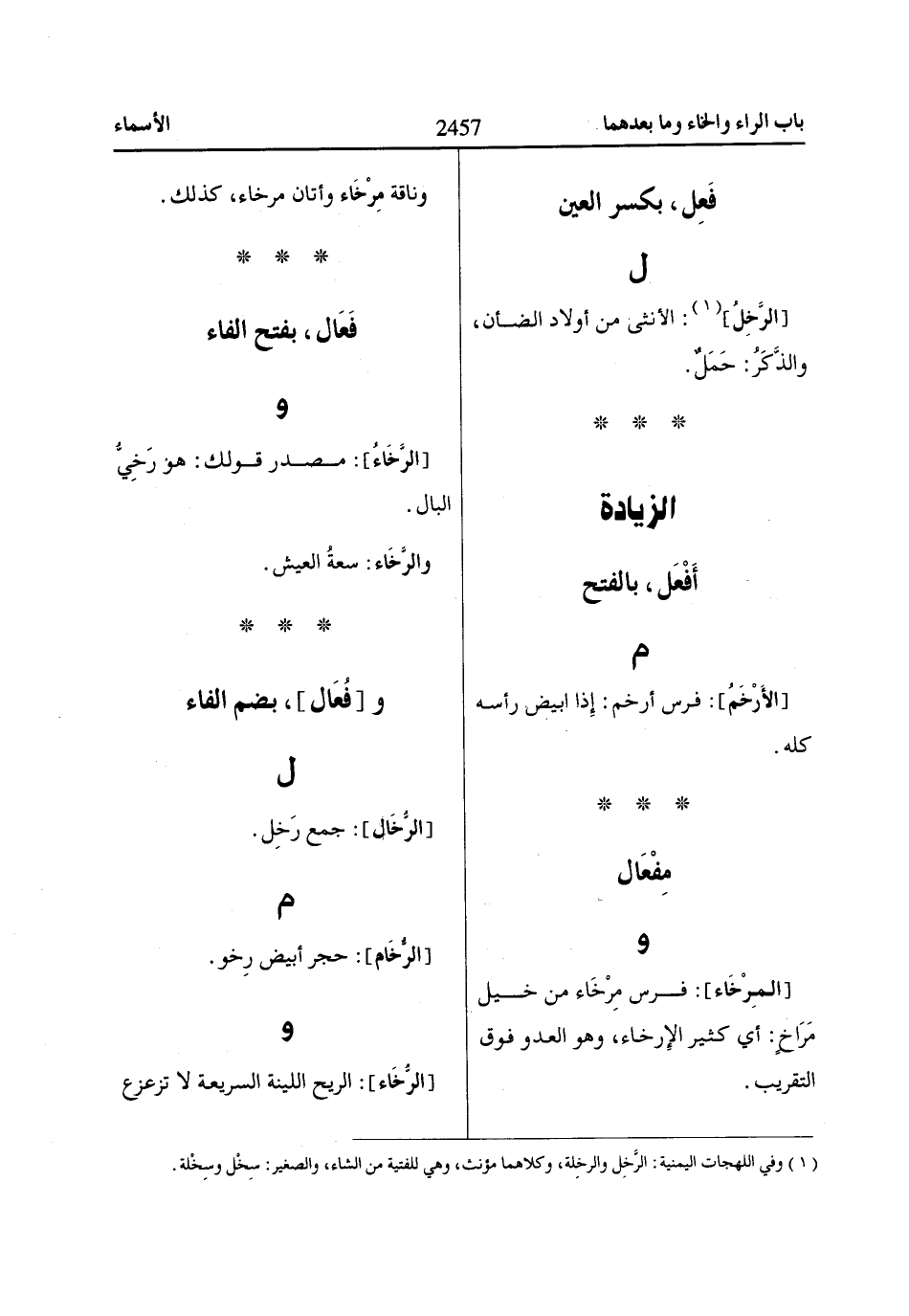 (1) وفي اللهجات اليمنية: الرَّخِل والرخلة، وكلاهما مؤنث، وهي للفتية من الشاء، والصغير: سِخْل وسِخْلة.