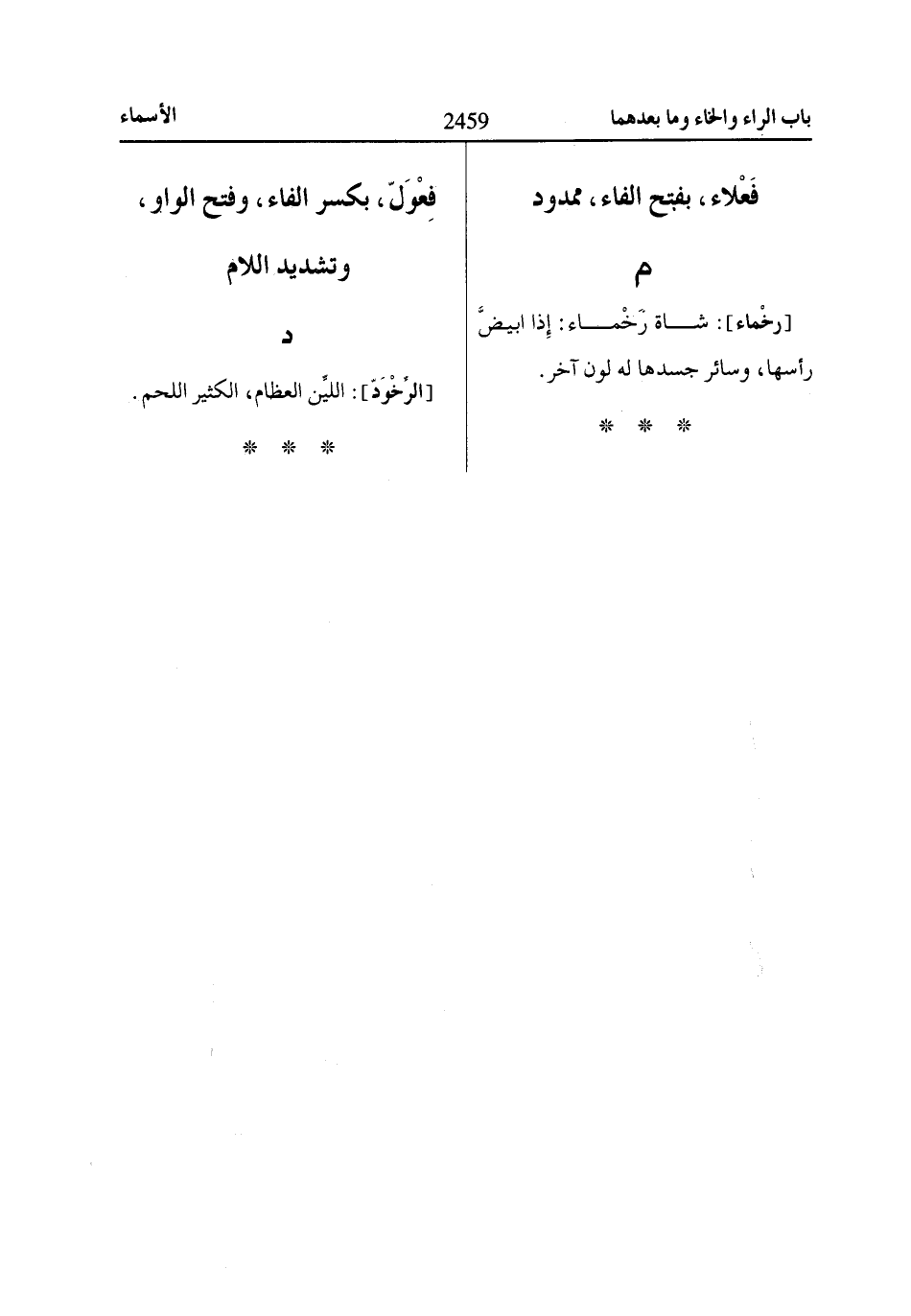 [رخْماء]: شاة رَخْماء: إِذا ابيضَّ رأسها، وسائر جسدها له لون آخر.