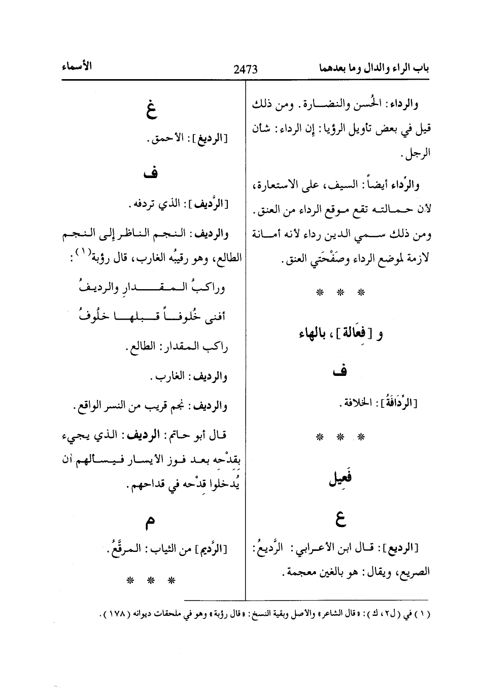 والرديف: النجم الناظر إِلى النجم الطالع، وهو رقيبُه الغارب، قال رؤبة «1»: