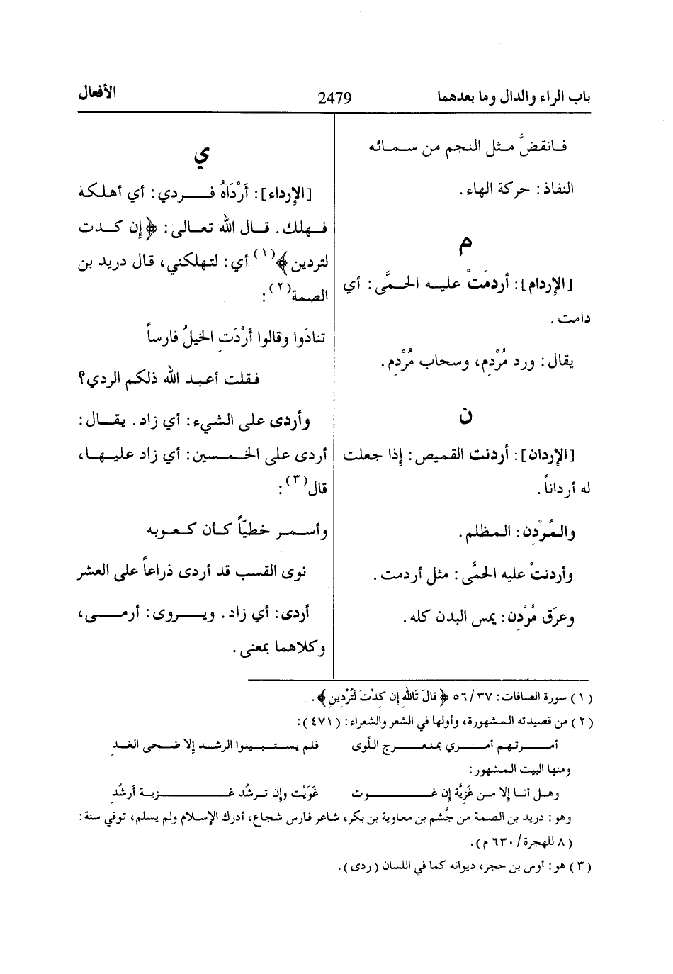 [الإِرداء]: أَرْدَاهُ فردي: أي أهلكه فهلك. قال الله تعالى: إِنْ كِدْتَ لَتُرْدِينِ «1» أي: لتهلكني، قال دريد بن الصمة «2»: