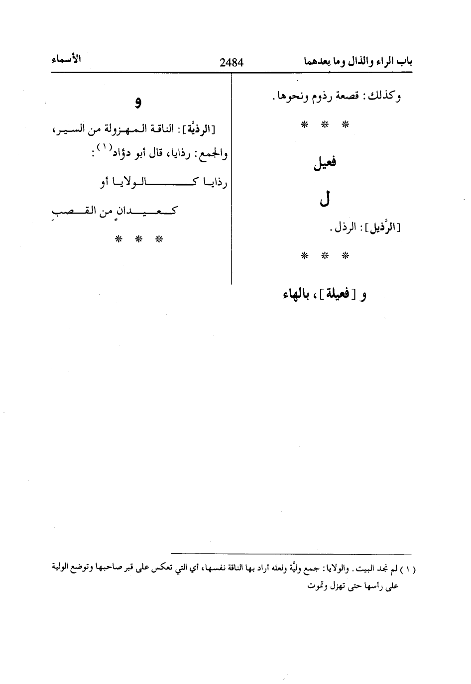 (1) لم نجد البيت. والولايا: جمع وليَّة ولعله أراد بها الناقة نفسها، أي التي تعكس على قبر صاحبها وتوضع الولية على رأسها حتى تهزل وتموت