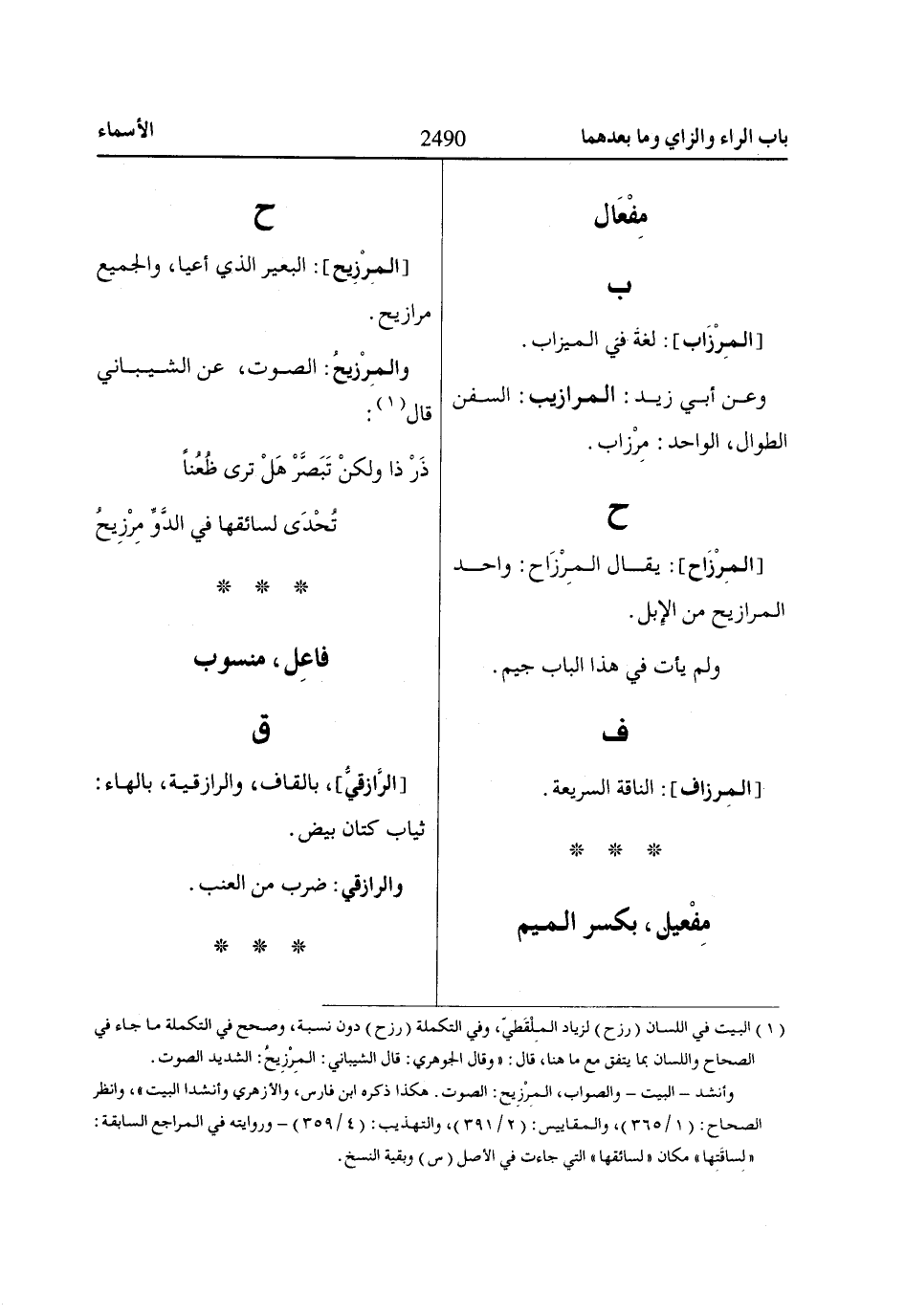 (1) البيت في اللسان (رزح) لزياد المِلْقَطيّ، وفي التكملة (رزح) دون نسبة، وصحح في التكملة ما جاء في الصحاح واللسان بما يتفق مع ما هنا، قال: «وقال الجوهري: قال الشيباني: المِرْزِيحُ: الشديد الصوت.