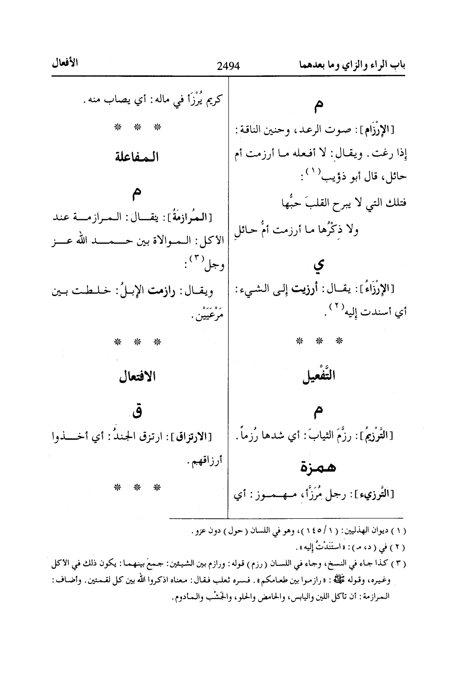 [المُرازمَةُ]: يقال: المرازمة عند الأكل: الموالاة بين حمد الله عز وجل «3»: