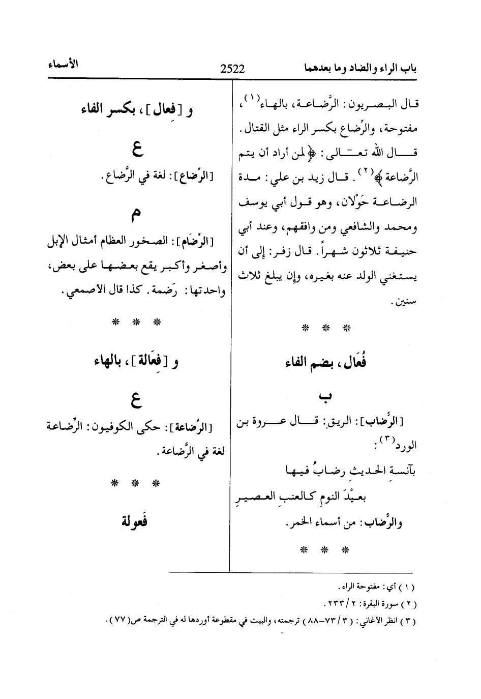 [الرِّضاعة]: حكى الكوفيون: الرِّضاعة لغة في الرَّضاعة.