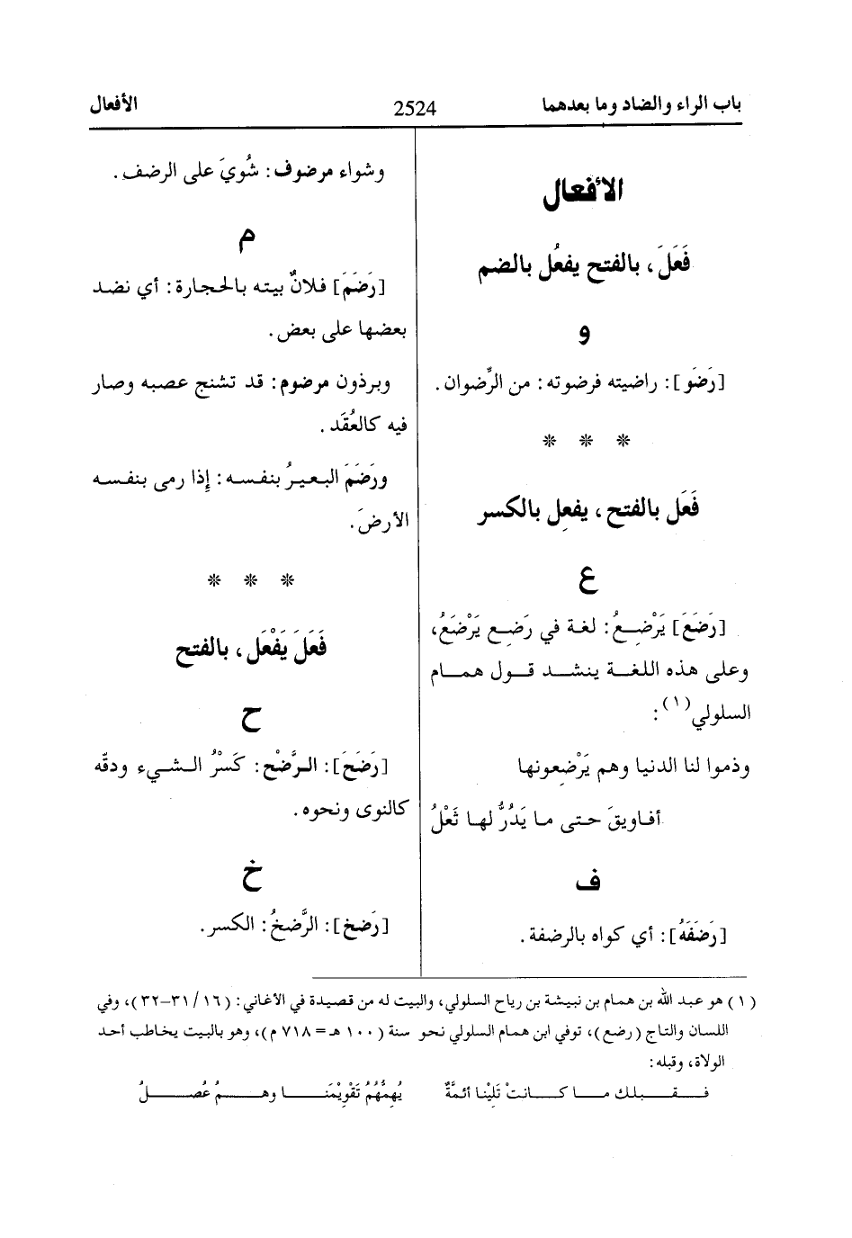 [رَضَعَ] يَرْضِعُ: لغة في رَضِع يَرْضَعُ، وعلى هذه اللغة ينشد قول همام السلولي «1»:
