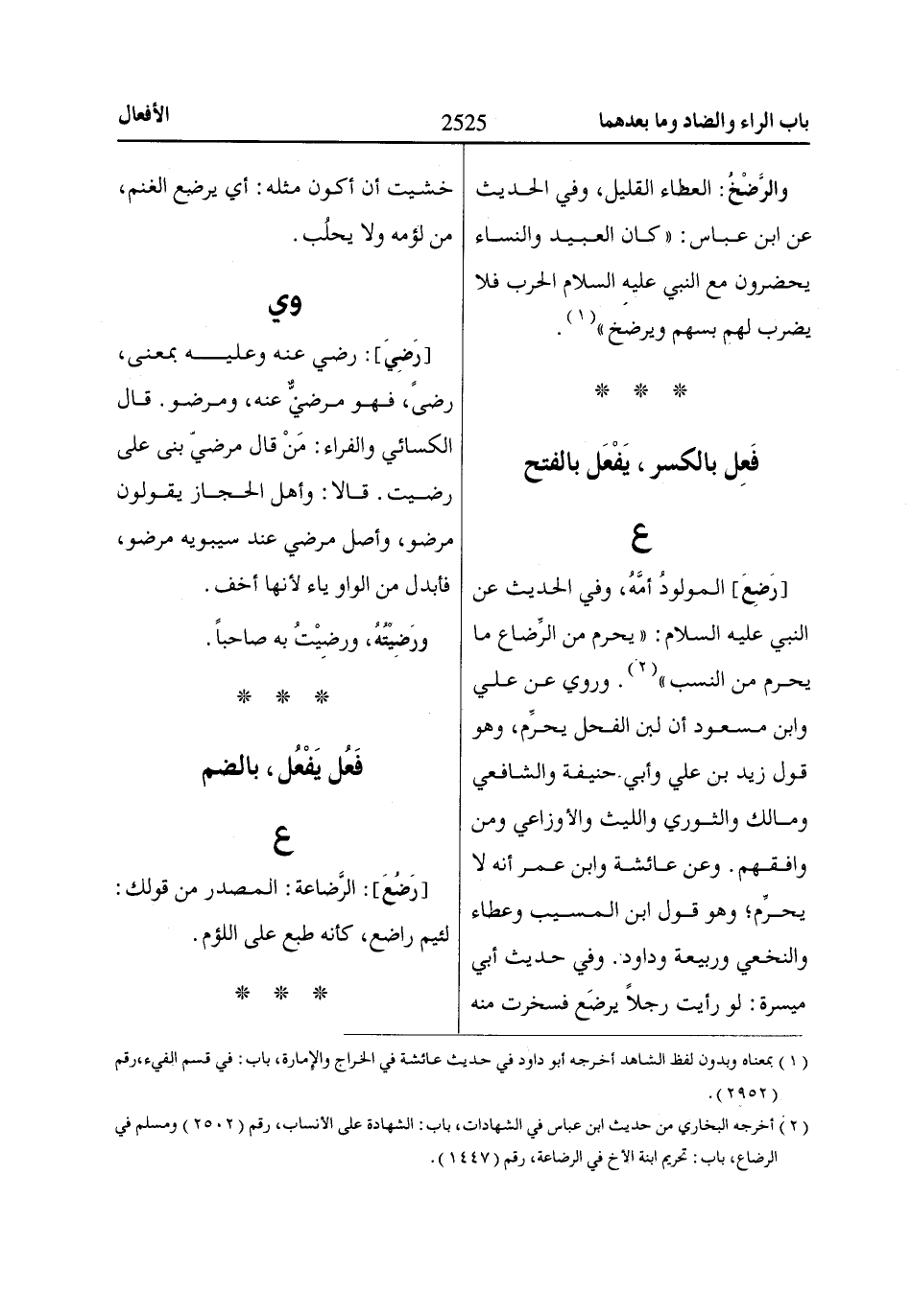 [رَضِيَ]: رضي عنه وعليه بمعنى، رضىً، فهو مرضيٌّ عنه، ومرضو. قال الكسائي والفراء: مَنْ قال مرضيّ بنى على رضيت. قالا: وأهل الحجاز يقولون مرضو، وأصل مرضي عند سيبويه مرضو، فأبدل من الواو ياء لأنها أخف.