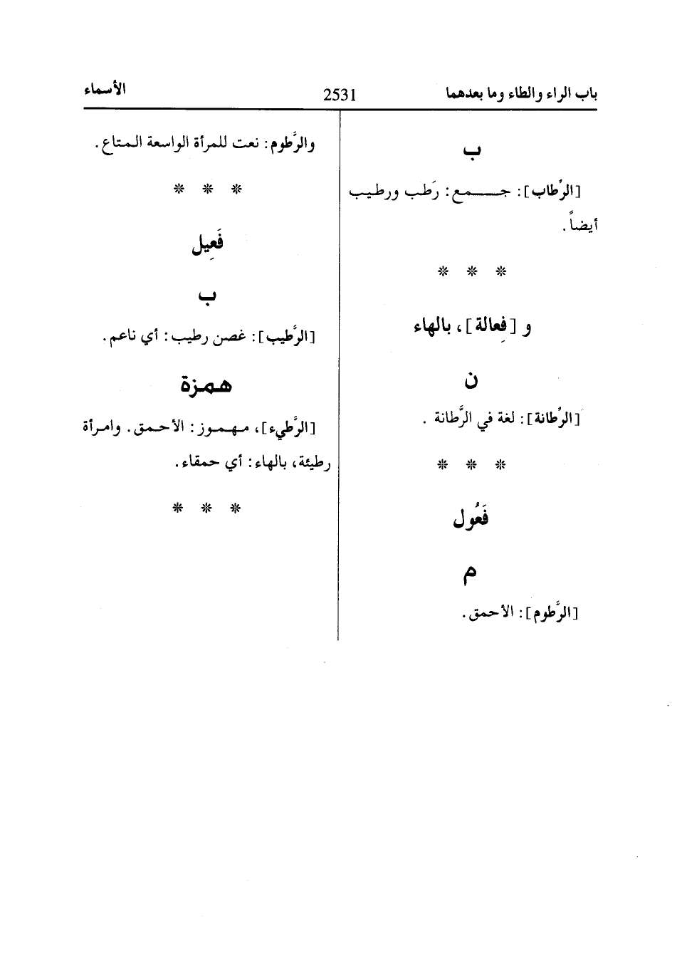 [الرَّطيء]، مهموز: الأحمق. وامرأة رطيئة، بالهاء: أي حمقاء.