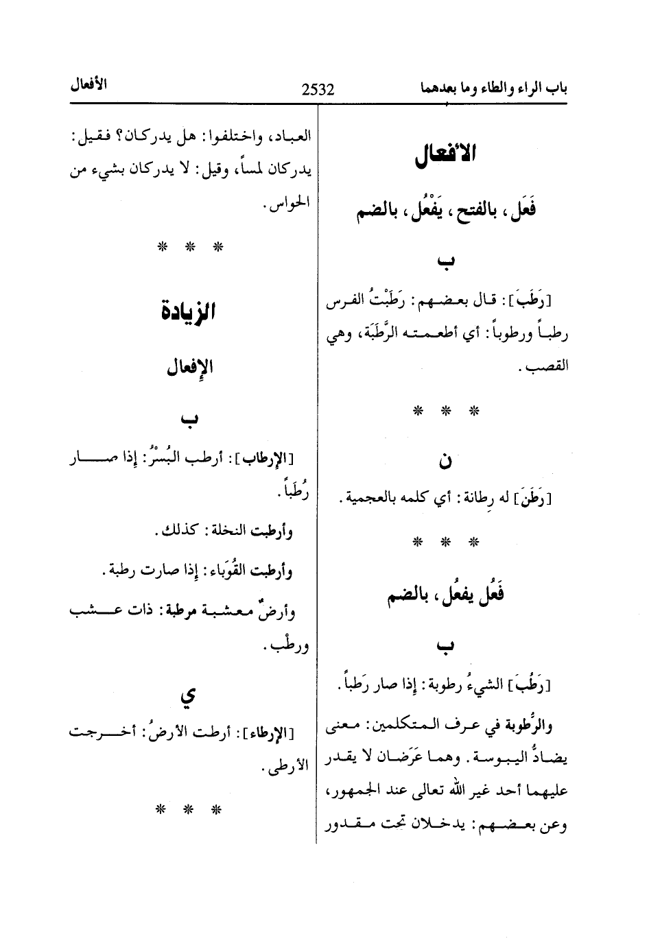 [رَطَبَ]: قال بعضهم: رَطَبْتُ الفرس رطباً ورطوباً: أي أطعمته الرَّطَبَة، وهي القصب.