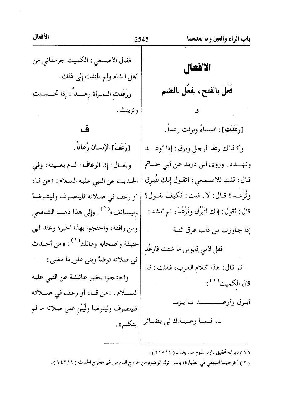 وكذلك رَعَد الرجل وبرق: إِذا أوعد وتهدد. وروى ابن دريد عن أبي حاتم قال: قلت للأصمعي: أتقول إِنك لتُبرِق وتُرْعد؟ قال: لا. قلت: فكيفَ تقول؟