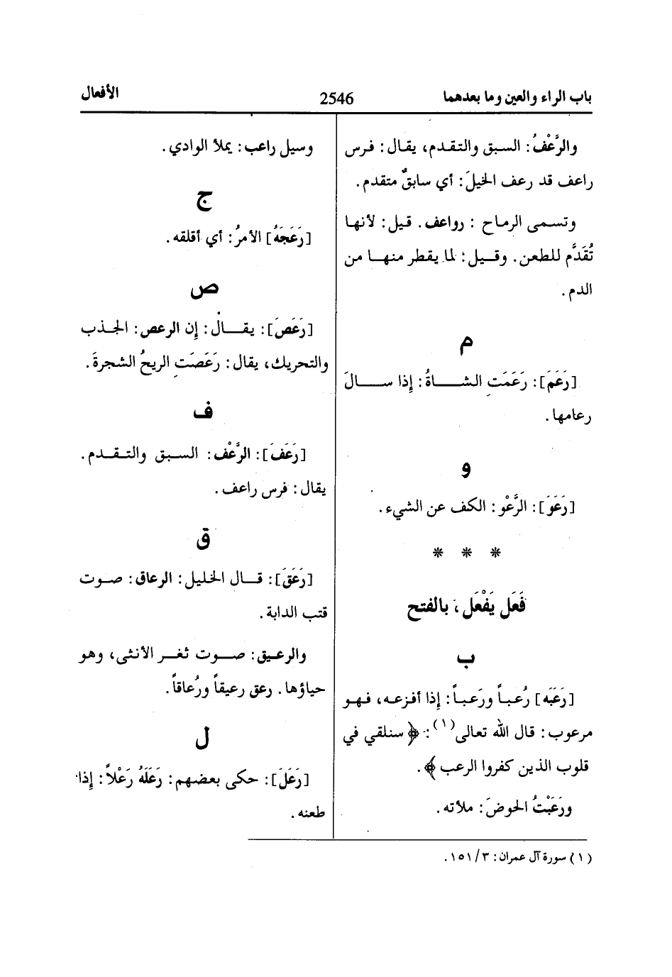 [رَعَبَه] رُعباً ورَعباً: إِذا أفزعه، فهو مرعوب: قال الله تعالى «1»: سَنُلْقِي فِي قُلُوبِ الَّذِينَ كَفَرُوا الرُّعْبَ.