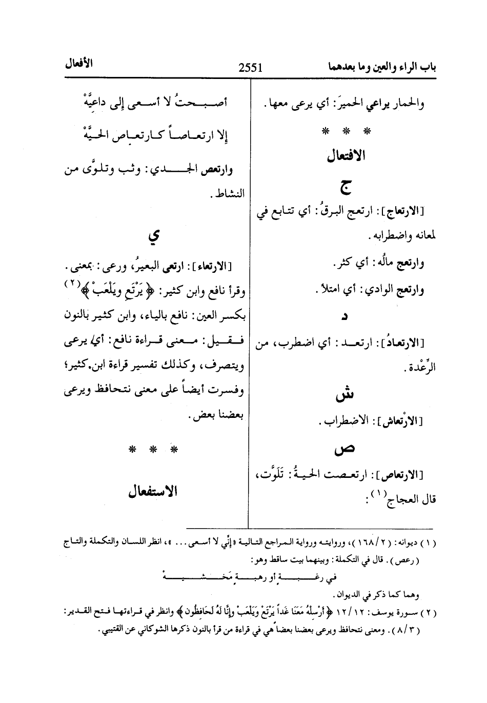 (1) ديوانه: (2/ 168)، وروايته ورواية المراجع التالية «إنِّي لا أسعى ... »، انظر اللسان والتكملة والتاج (رعص). قال في التكملة: وبينهما بيت ساقط وهو: