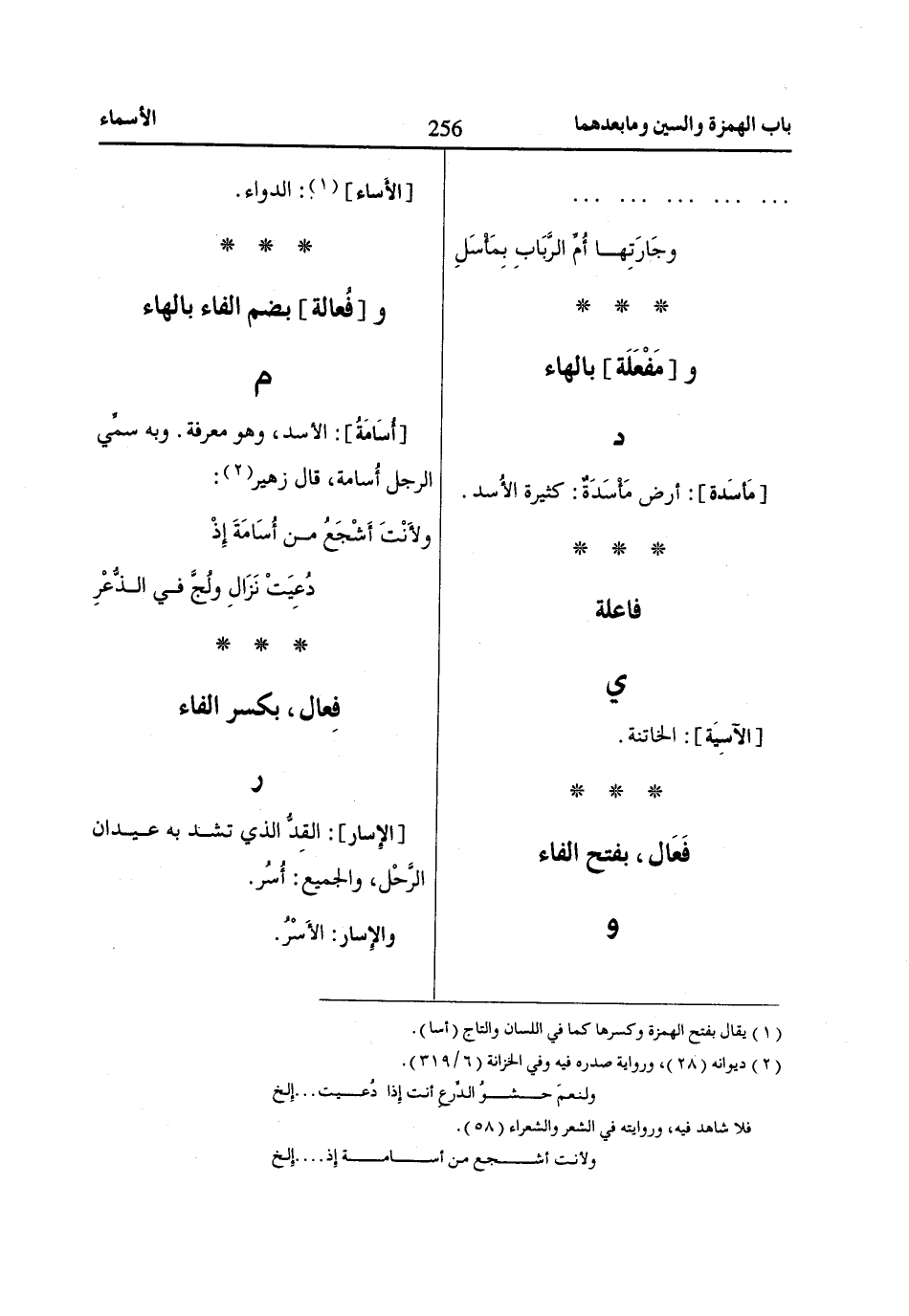 [أُسَامَةُ]: الأسد، وهو معرفة. وبه سمِّي الرجل أُسامة، قال زهير «2»: