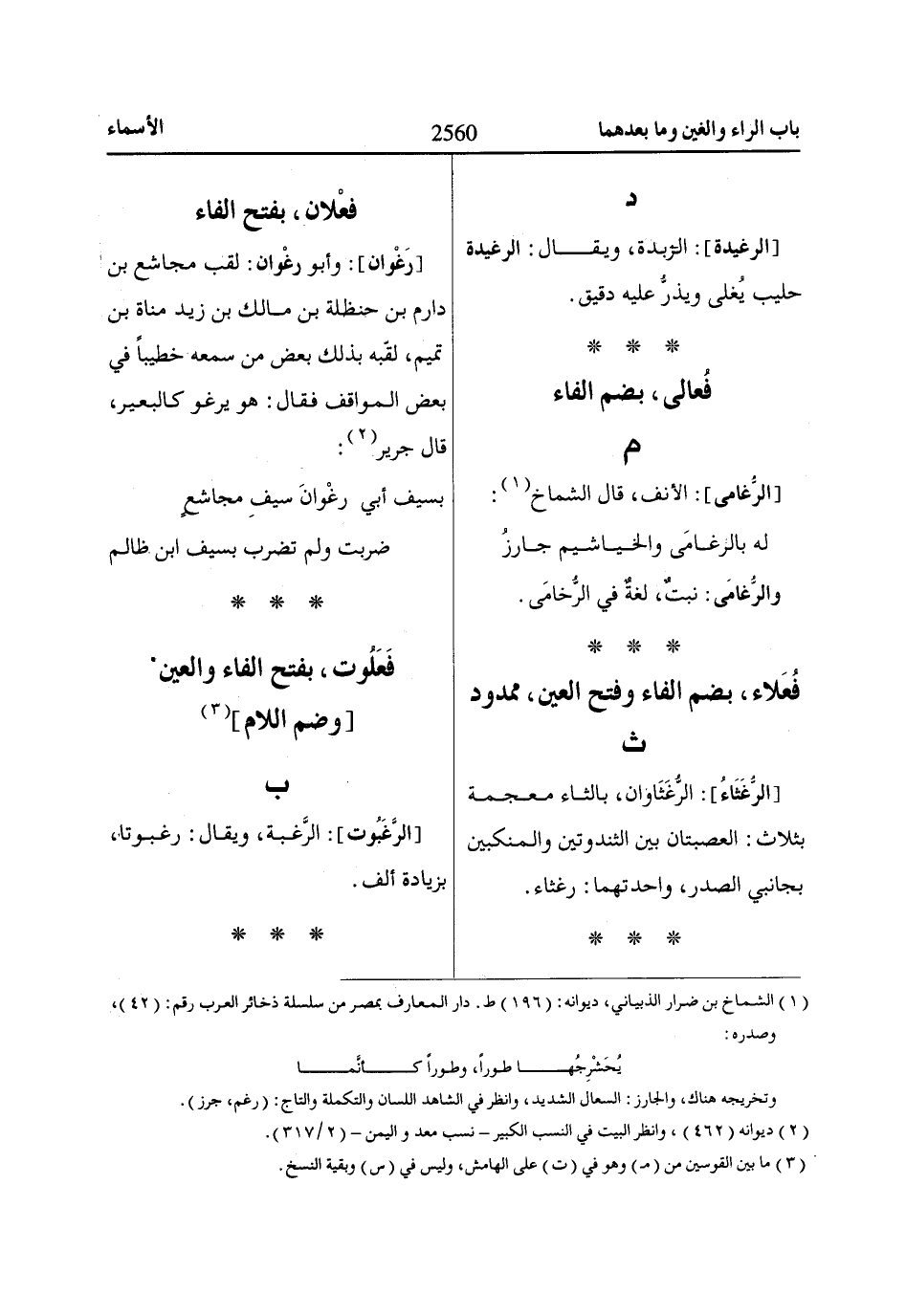 [رَغْوان]: وأبو رغْوان: لقب مجاشع بن دارم بن حنظلة بن مالك بن زيد مناة بن تميم، لقّبه بذلك بعض من سمعه خطيباً في بعض المواقف فقال: هو يرغو كالبعير، قال جرير «2»: