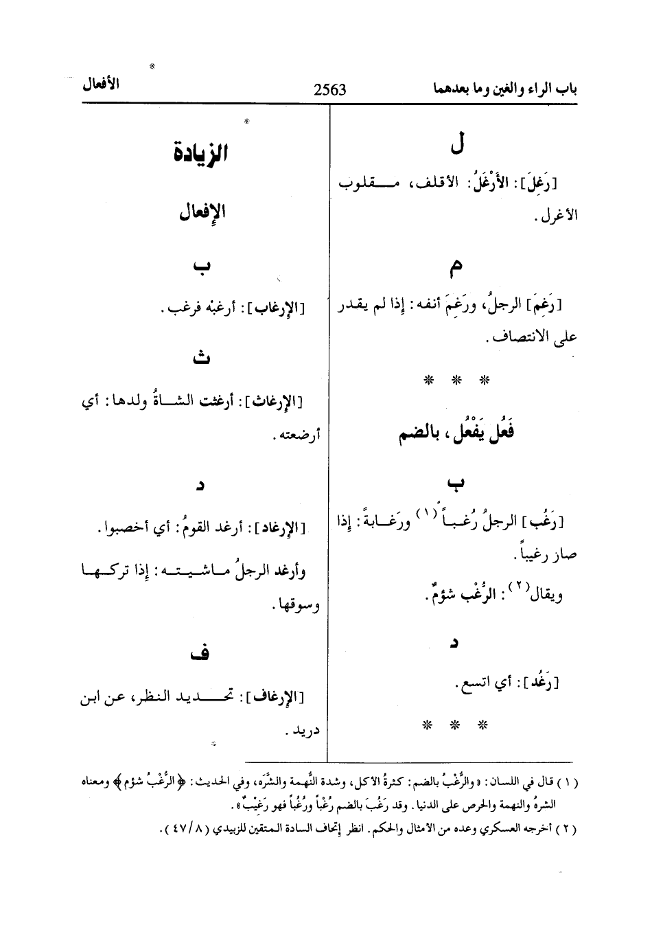 (1) قال في اللسان: «والرُّغْبُ بالضم: كثرةُ الأكل، وشدة النُّهمة والشَّرَه، وفي الحديث: الرغب شؤم ومعناه الشرهُ والنهمة والحرص على الدنيا. وقد رَغُبَ بالضم رُغْباً رُغُباً فهو رَغِيْبٌ».