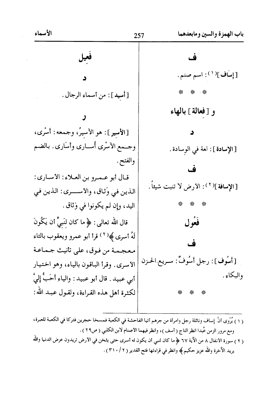 (1) يُرْوى أنَّ إِساف ونائلة رجل وامرأة من جرهم أتيا الفاحشة في الكعبة فمسخا حجرين فتركا في الكعبة للعبرة، ومع مرور الزمن عُبدا انظر التاج (أسف)، وانظر فيهما الأصنام لابن الكلبي (ص 29).