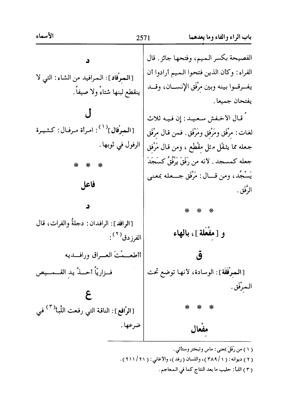 [المِرْفاد]: المرافيد من الشاء: التي لا ينقطع لبنها شتاءً ولا صيفاً.