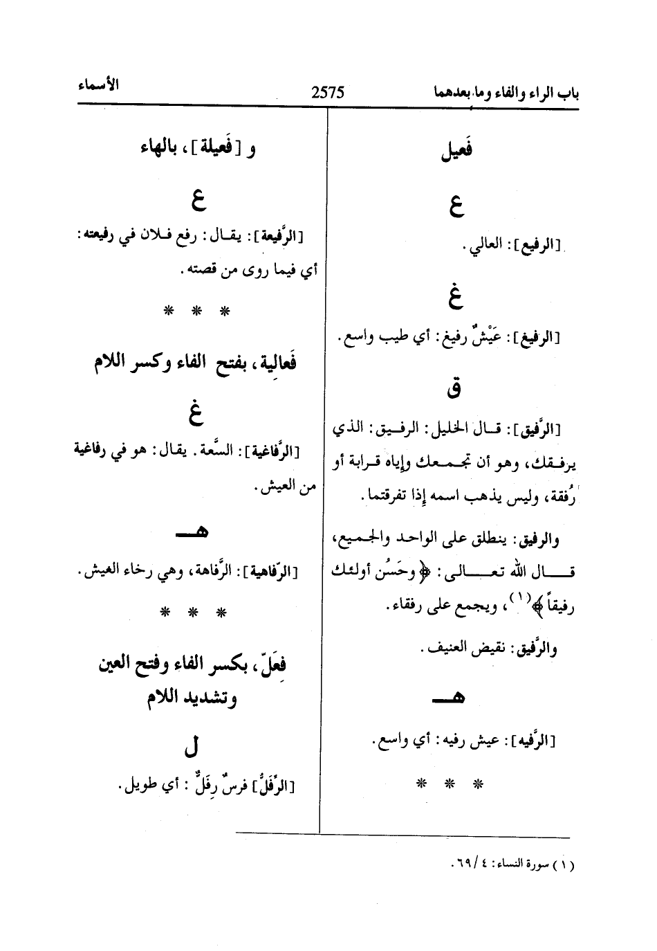 والرفيق: ينطلق على الواحد والجميع، قال الله تعالى: وَحَسُنَ أُولائِكَ رَفِيقاً «1»، ويجمع على رفقاء.