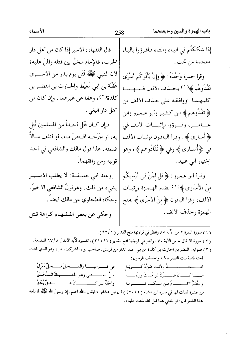 وقرأ حمزة وَحْدَهُ: وإن يأتوكم أسرى تفدوهم «1» بحذف الألف فيهما كليهما. ووافقه على حذف الألف من تفدوهم ابن كثير وأبو عمرو وابن عامر، وقرؤوا بإِثبات الألف في أُساارى. وقرأ الباقون بإِثبات الألف في أُساارى وفي تُفاادُوهُمْ، وهو اختيار أبي عبيد.