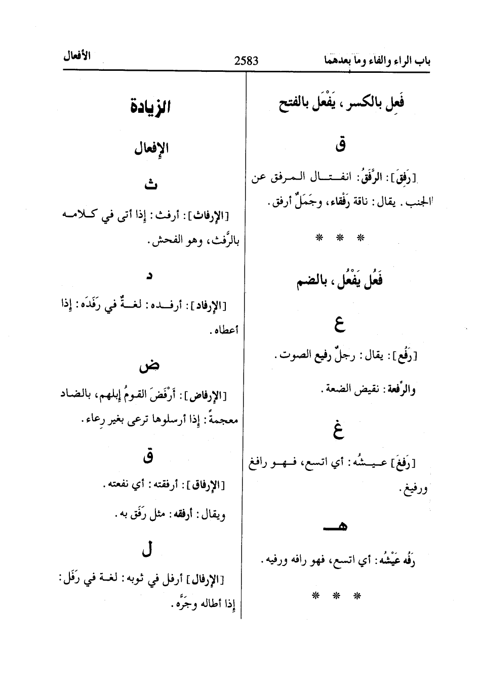 [رَفِقَ]: الرَّفَقُ: انفتال المرفق عن الجنب. يقال: ناقة رَفْقاء، وجَمَلٌ أرفق.