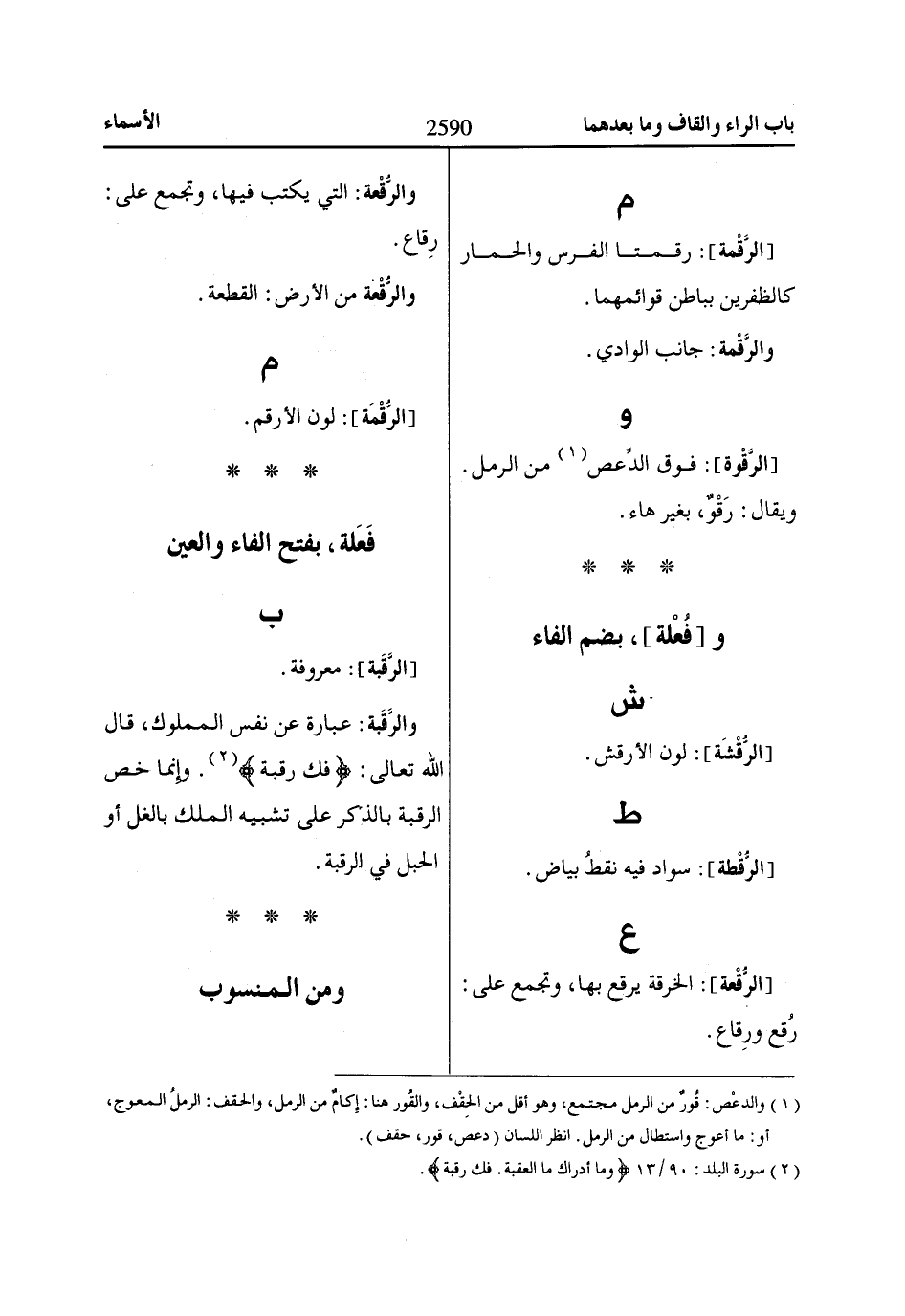 [الرَّقْمة]: رقمتا الفرس والحمار كالظفرين بباطن قوائمهما.