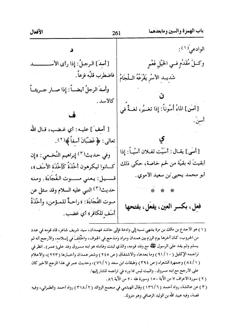 [أَسِدَ] الرجلُ: إِذا رأى الأَسد فاضطرب قلبُه فزعاً.