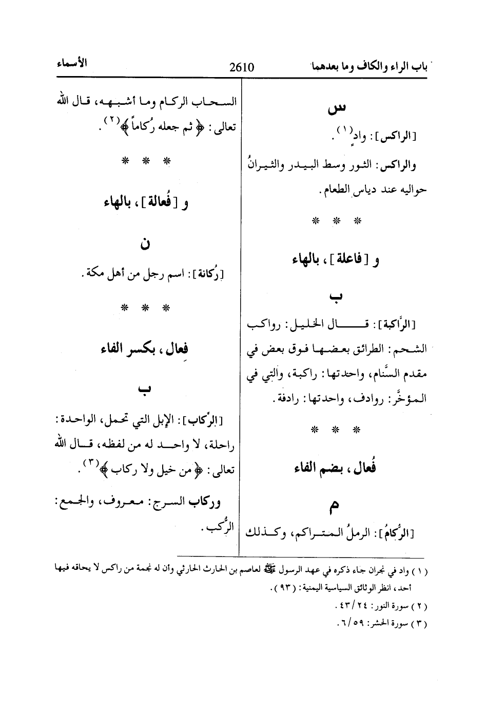 (1) واد في نجران جاء ذكره في عهد الرسول صلّى الله عليه وسلم لعاصم بن الحارث الحارثي وأن له نجمة من راكس لا يحاقه فيها أحد، انظر الوثائق السياسية اليمنية: (93).