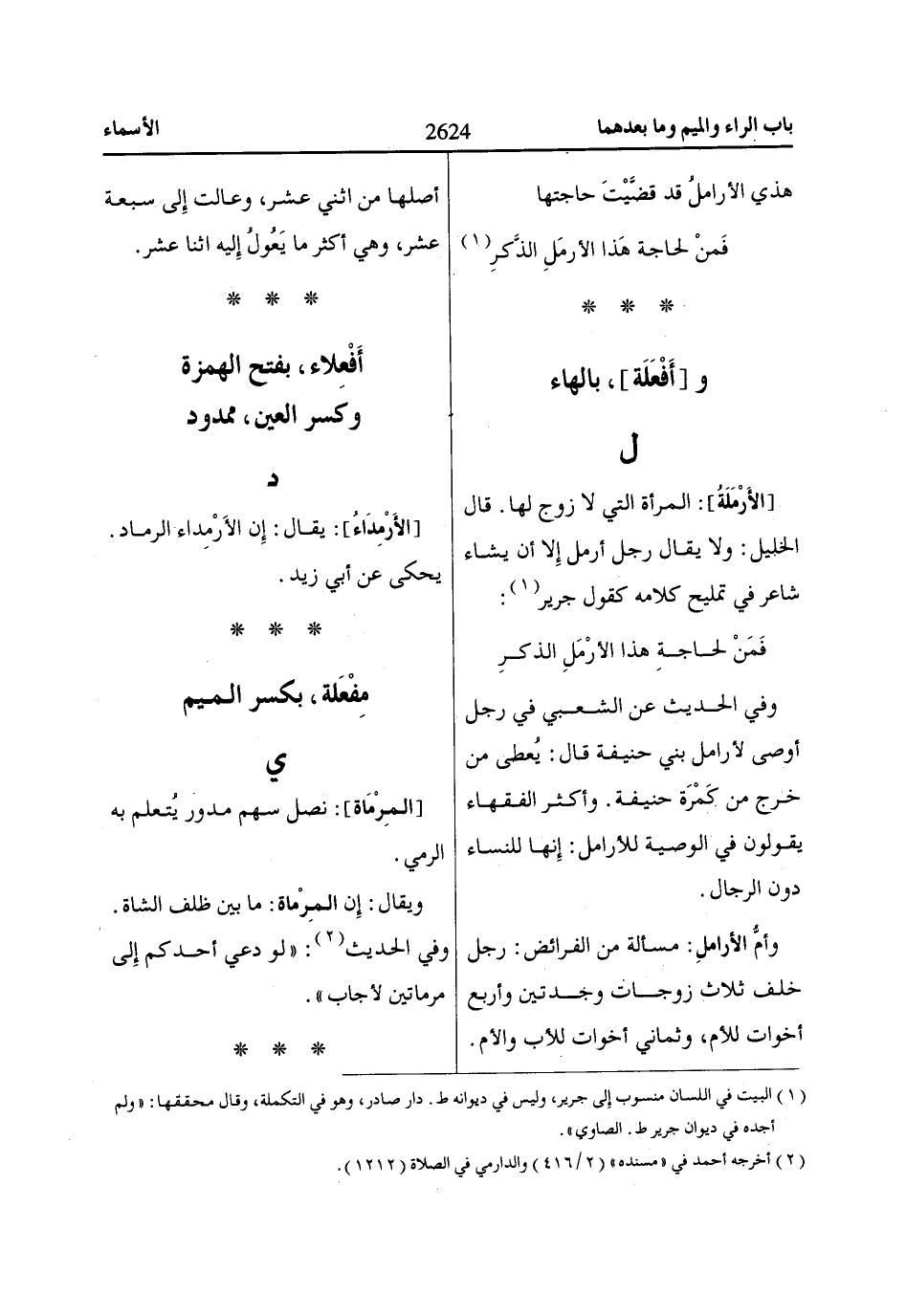 [الأَرْمَلَةُ]: المرأة التي لا زوج لها. قال الخليل: ولا يقال رجل أرمل إِلا أن يشاء شاعر في تمليح كلامه كقول جرير «1»: