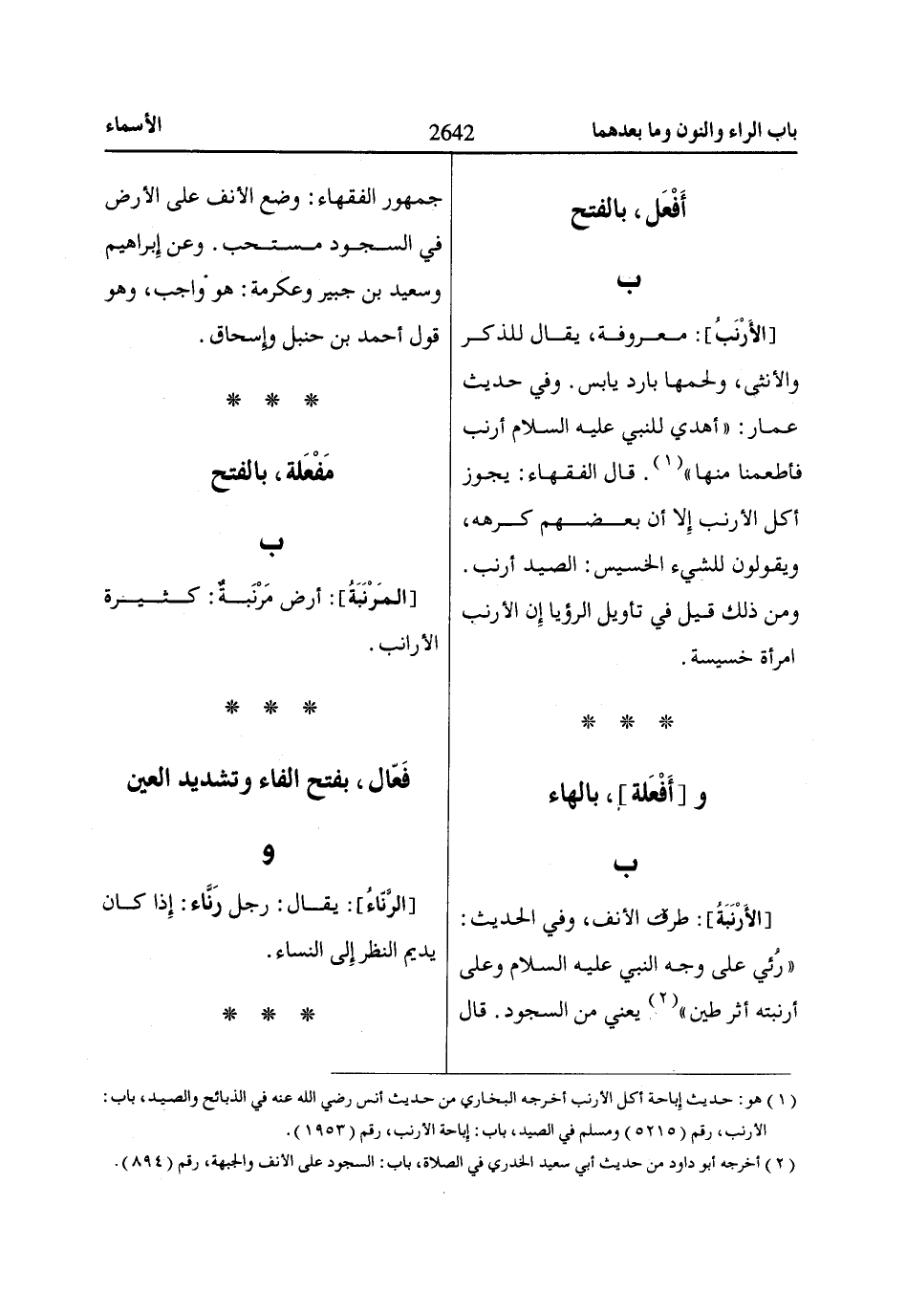 قال الفقهاء: يجوز أكل الأرنب إِلا أن بعضهم كرهه، ويقولون للشيء الخسيس: الصيد أرنب.