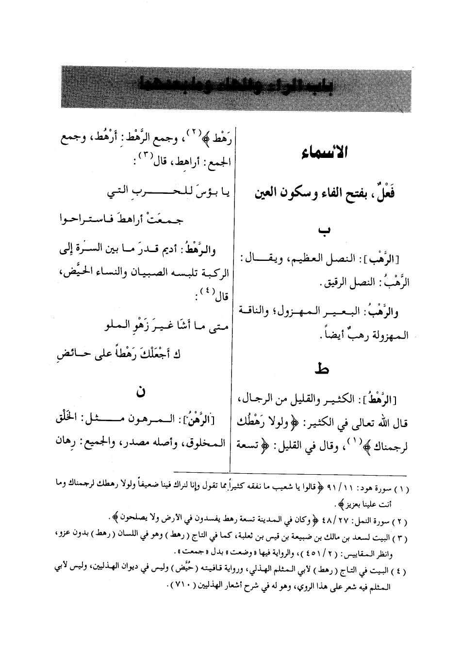 (4) البيت في التاج (رهط) لأبي المثلم الهذلي، ورواية قافيته (حُيَّض) وليس في ديوان الهذليين، وليس لأبي المثلم فيه شعر على هذا الروي، وهو له في شرح أشعار الهذليين (710).
