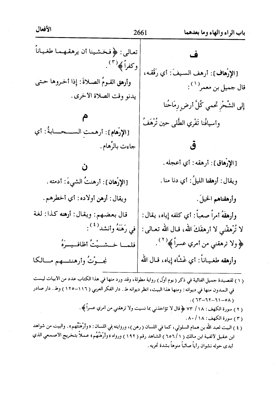 وأرهقه طغياناً: أي غَشَّاه إِياه، قال الله تعالى: فَخَشِيناا أَنْ يُرْهِقَهُماا طُغْيااناً وَكُفْراً «3».