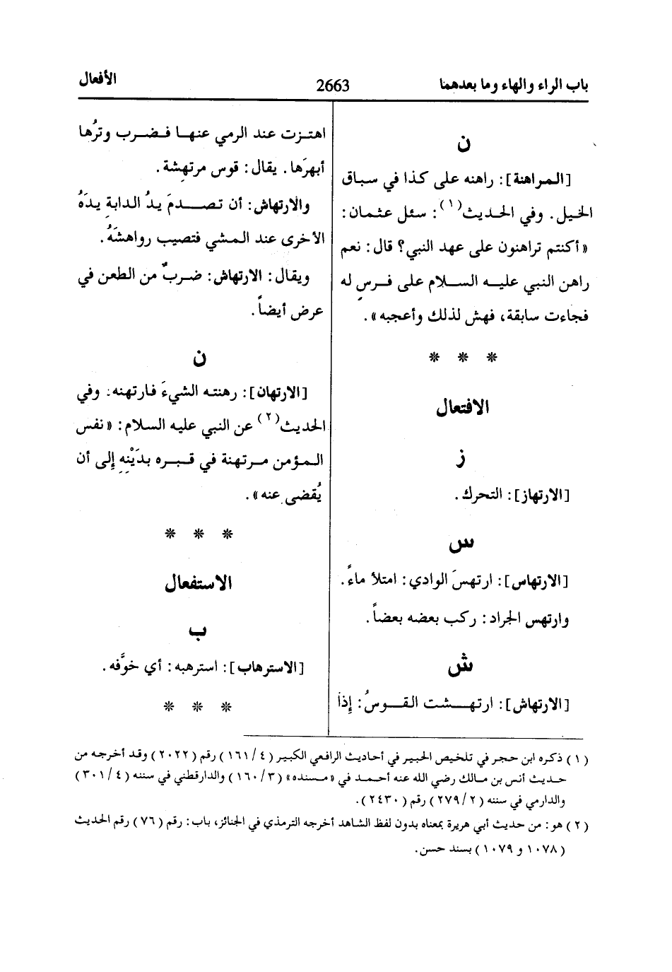 [الارتهاش]: ارتهشت القوسُ: إِذا اهتزت عند الرمي عنها فضرب وترُها أبهرَها. يقال: قوس مرتهِشة.