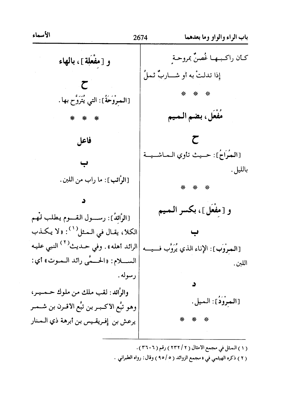 [الرَّائِدُ]: رسول القوم يطلب لهم الكلأ، يقال في المثل «1»: «لا يكذب الرائد أهله».