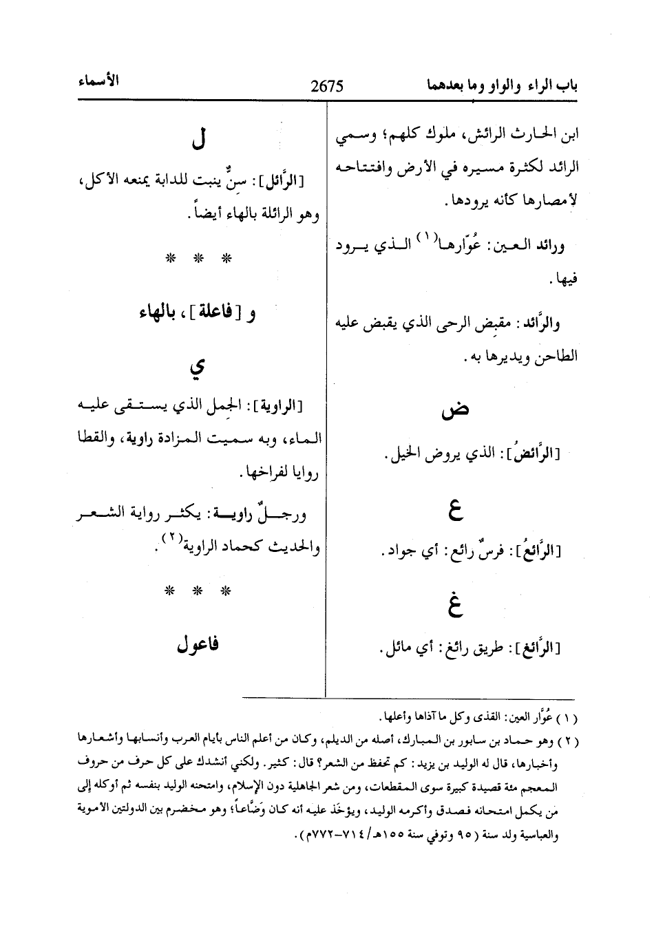 (2) وهو حماد بن سابور بن المبارك، أصله من الديلم، وكان من أعلم الناس بأيام العرب وأنسابها وأشعارها وأخبارها، قال له الوليد بن يزيد: كم تحفظ من الشعر؟ قال: كثير. ولكني أنشدك على كل حرف من حروف المعجم مئة قصيدة كبيرة سوى المقطعات، ومن شعر الجاهلية دون الإسلام، وامتحنه الوليد بنفسه ثم أوكله إلى من يكمل امتحانه فصدق وأكرمه الوليد، ويؤخَذ عليه أنه كان وَضَّاعاً؛ وهو مخضرم بين الدولتين الأموية والعباسية ولد سنة (95 وتوفي سنة 155 هـ/ 714 - 772 م).