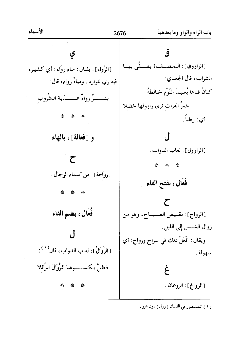 [الرَّواء]: يقال: ماء رَوَاء: أي كثير، فيه ري للوارد. ومياهٌ رواء، قال: