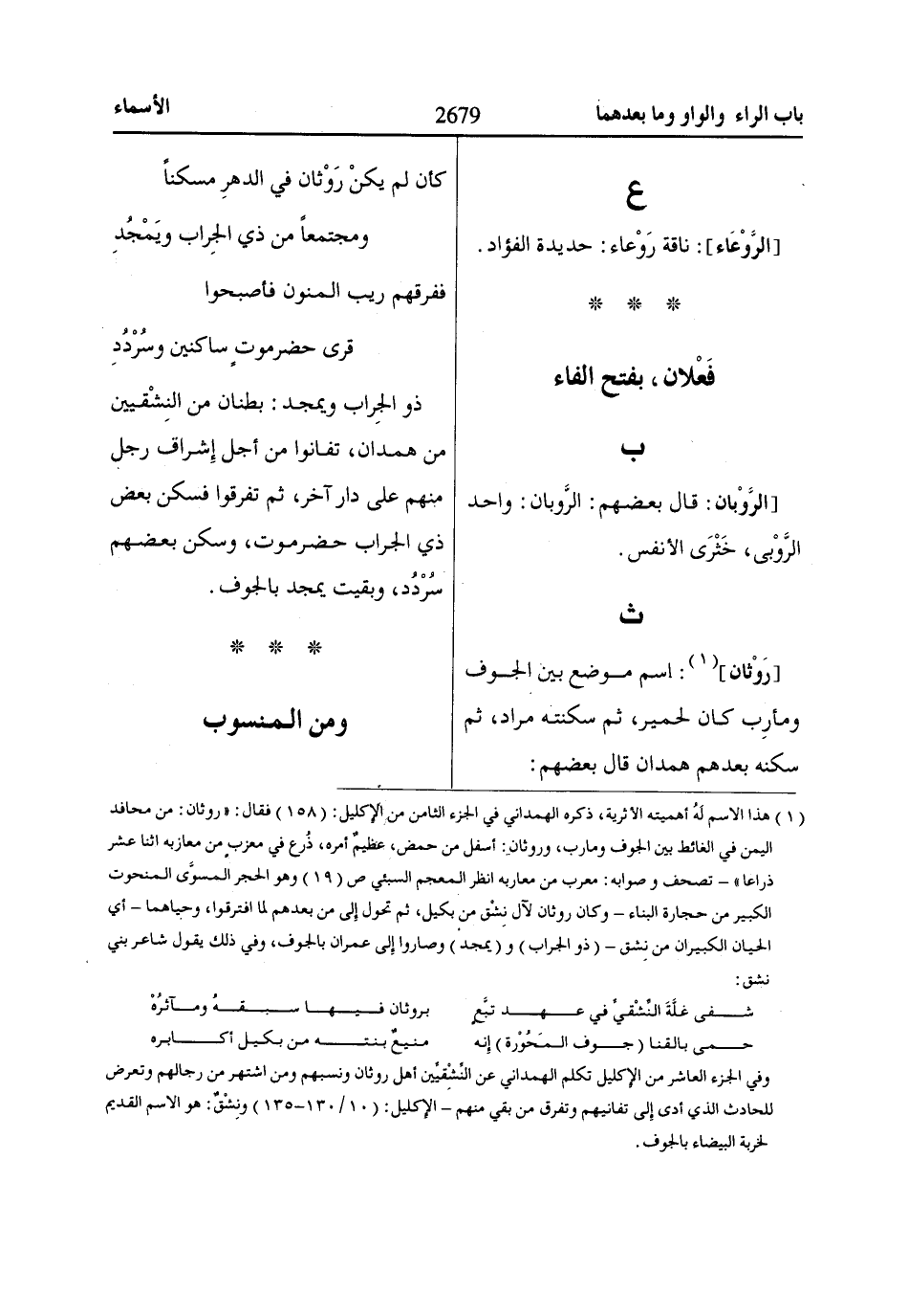 وفي الجزء العاشر من الإكليل تكلم الهمداني عن النِّشْقِيِّين أهل روثان ونسبهم ومن اشتهر من رجالهم وتعرض للحادث الذي أدى إلى تفانيهم وتفرق من بقي منهم- الإكليل: (10/ 130 - 135) ونِشْقٌ: هو الاسم القديم لخربة البيضاء بالجوف.