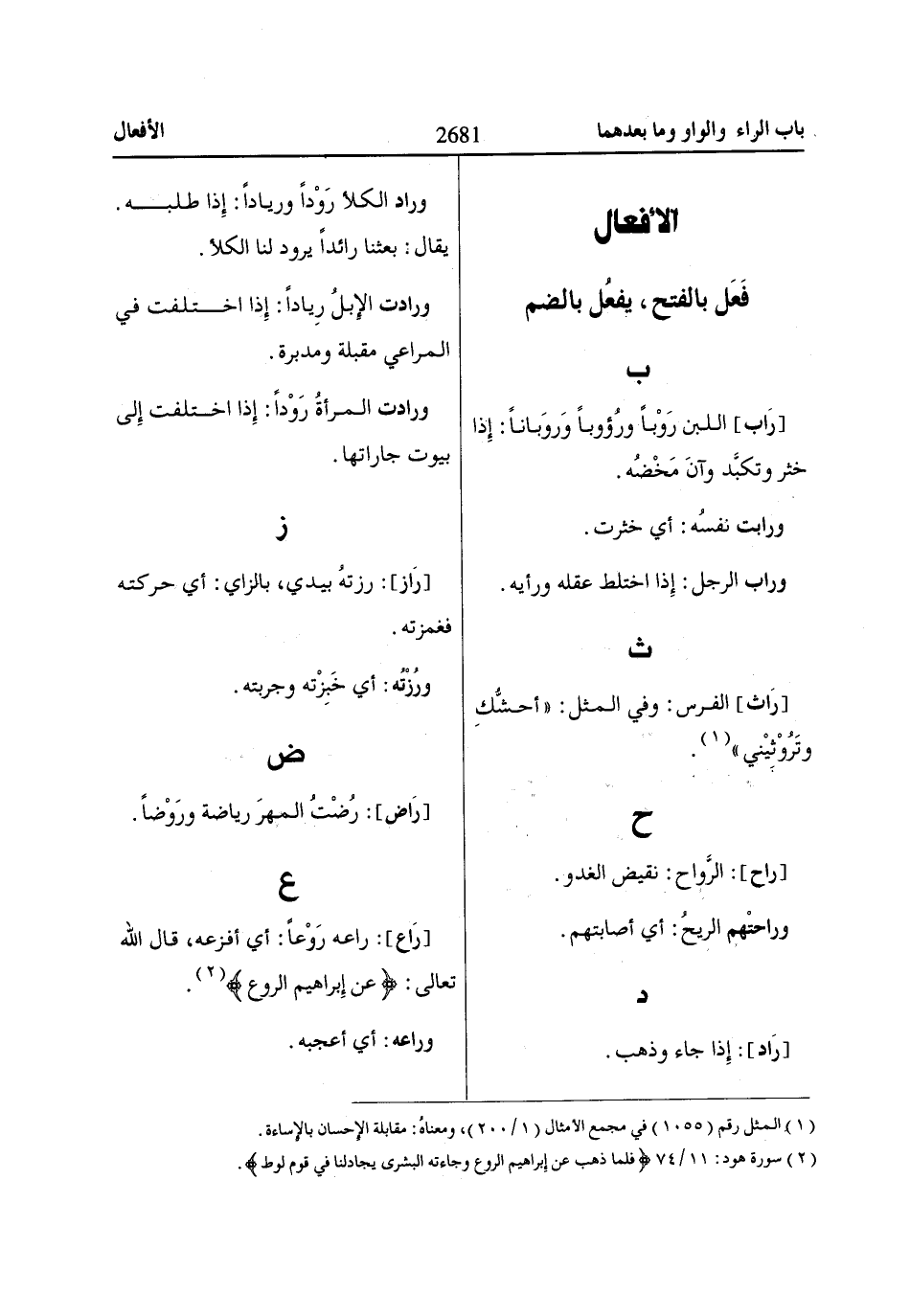 [رَاع]: راعه رَوْعاً: أي أفزعه، قال الله تعالى: عَنْ إِبْرااهِيمَ الرَّوْعُ «2».