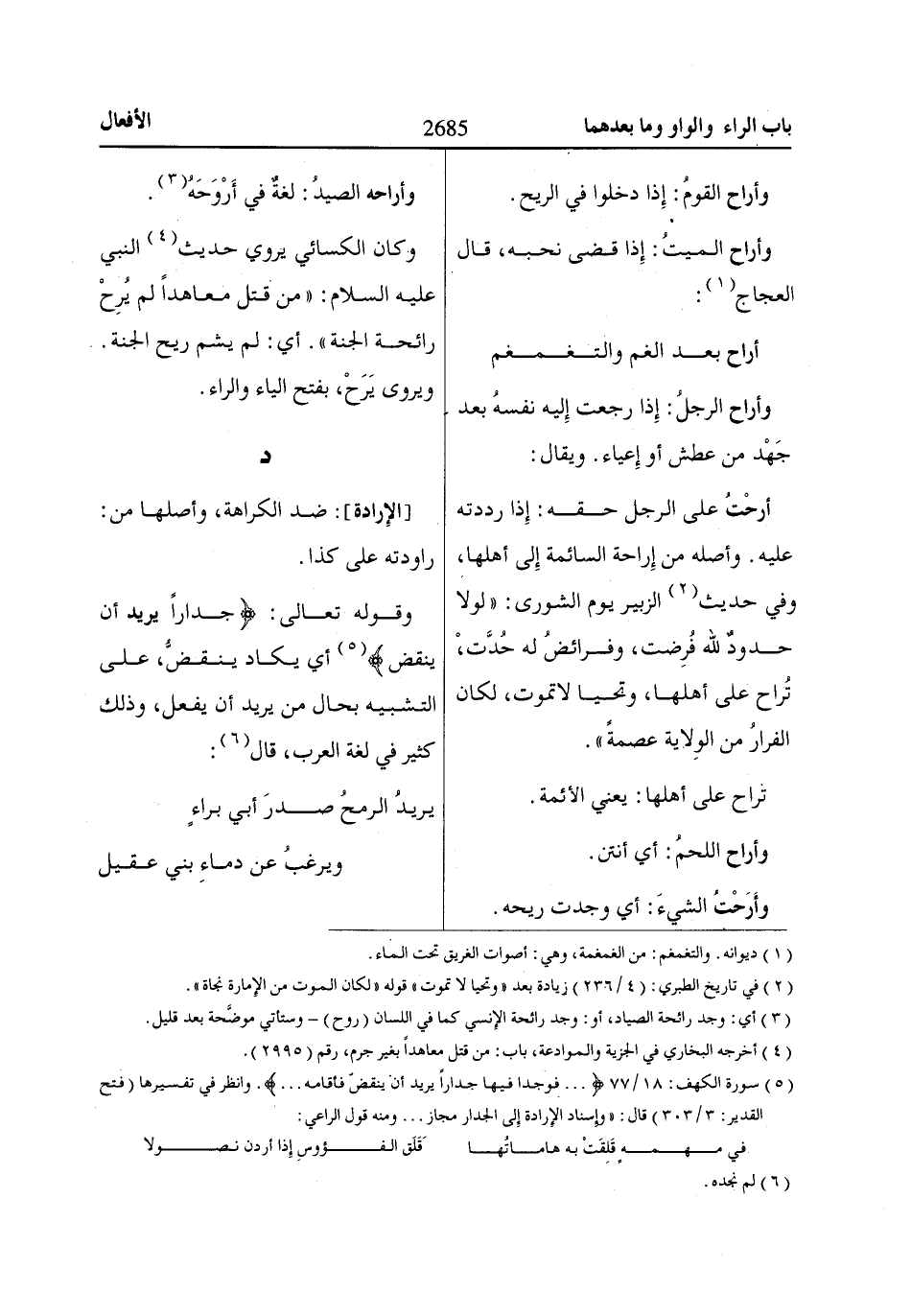 (5) سورة الكهف: 18/ 77 ... فَوَجَداا فِيهاا جِدااراً يُرِيدُ أَنْ يَنْقَضَّ فَأَقاامَهُ .... وانظر في تفسيرها (فتح القدير: 3/ 303) قال: «وإسناد الإرادة إلى الجدار مجاز ... ومنه قول الراعي: