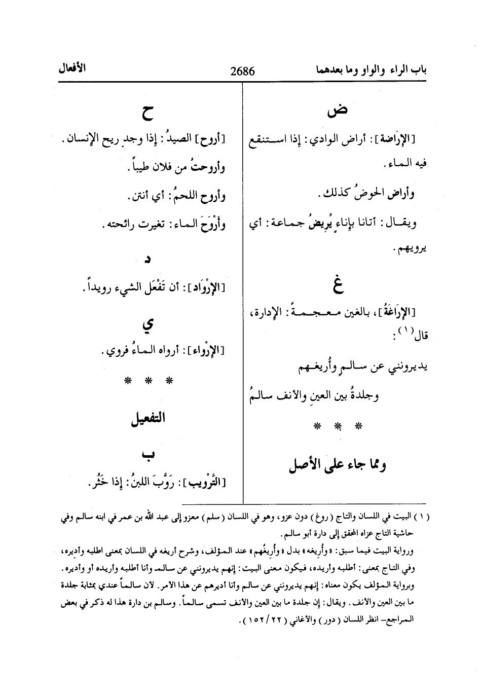 (1) البيت في اللسان والتاج (روغ) دون عزو، وهو في اللسان (سلم) معزو إلى عبد الله بن عمر في ابنه سالم وفي حاشية التاج عزاه المحقق إلى دارة أبو سالم.